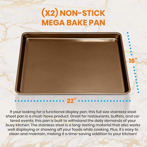 * 2 PIECE SET: Includes two mega bake pans (2 qt.) which measures (L x W x H) 21.9'' x 15.8'' x 1 '' -inches so you can make bulk batches of oven-baked cookies; Safe for kitchen ovens, countertop convection ovens, toaster oven