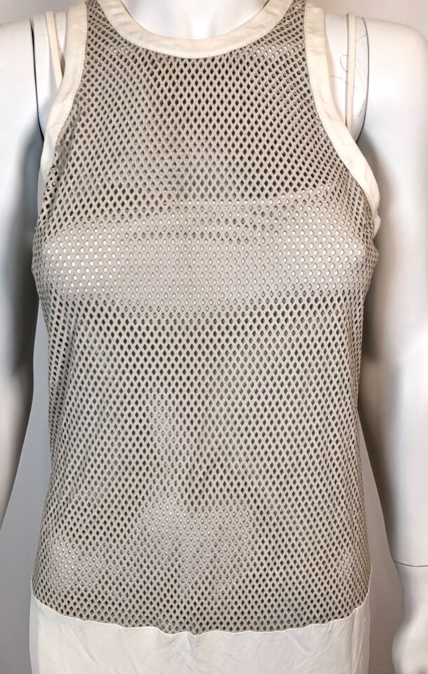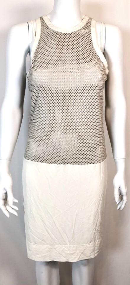 This is a great Helmut Lang dress. This RARE SAMPLE dress was never produced, and was shown only on the runway. White stretchy spaghetti strap underlayer and skirt with overlay of perforated tannish grayish perforated leather. One of a kind unproduced piece! No size tag because it is a sample. All of Helmut's samples are sz 2.