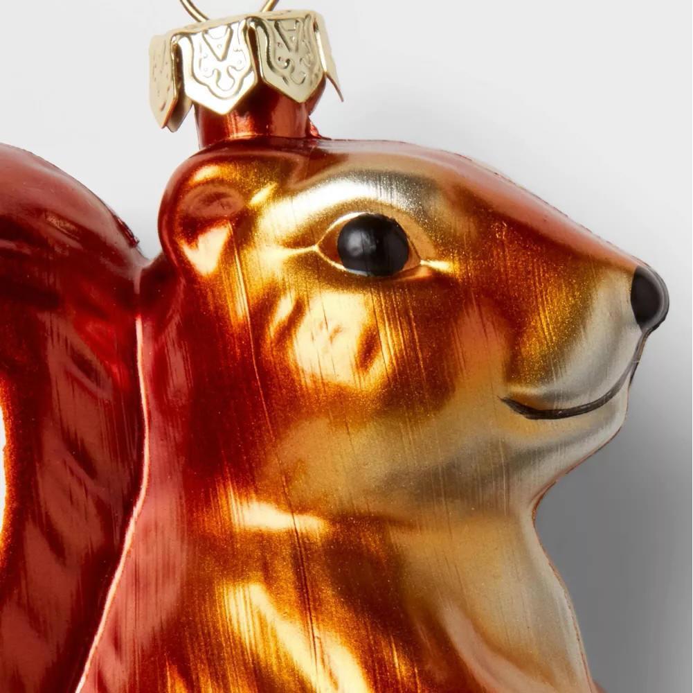 Add a dash of woodland whimsy to your holiday tree with this Squirrel Christmas Tree Ornament from Wondershop. This hanging ornament features a sculptural squirrel figurine in glossy brown and gold for a festive, playful look . Made of glass-like plastic (looks like a glass ornament but better - unbreakable), it also includes an attached top loop for easy hanging from the branches of your tree.