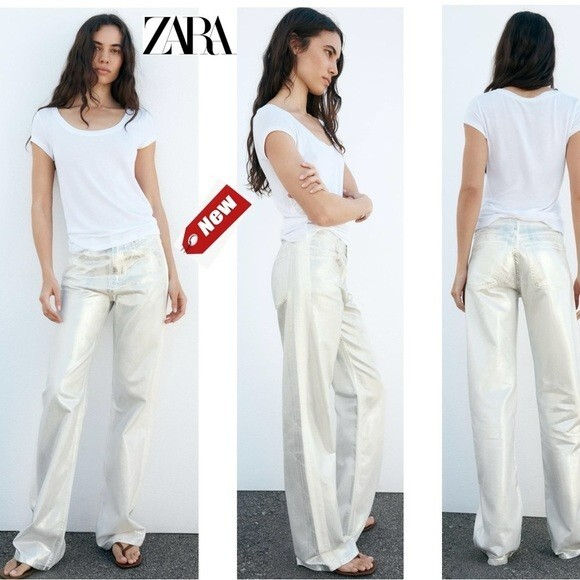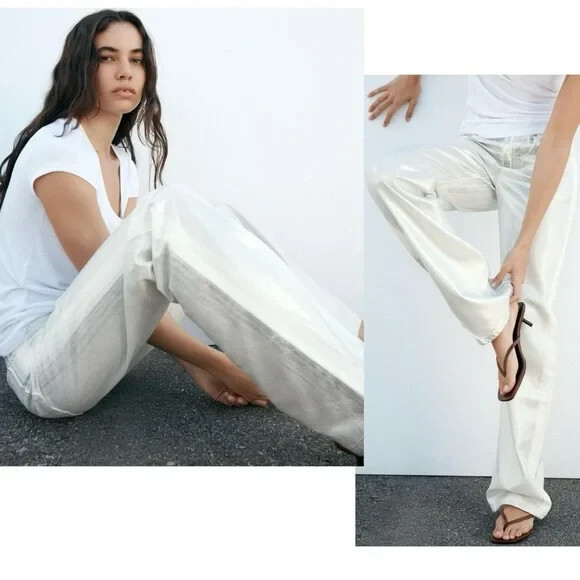 - NWT ZARA SILVER METALLIC FOIL MIDRISE 5 POCKET DENIM JEANS 32 - 0