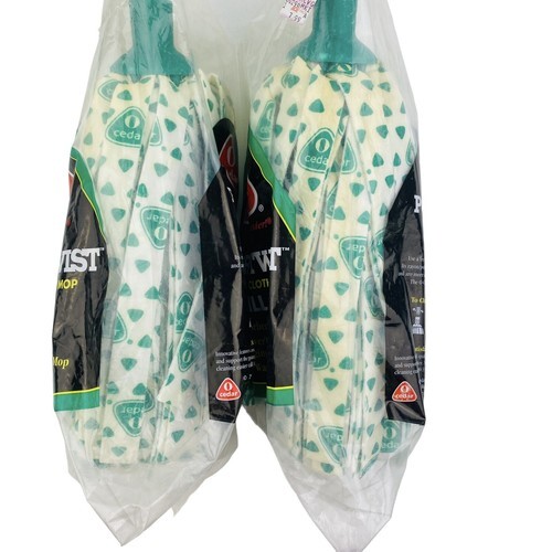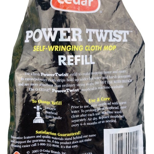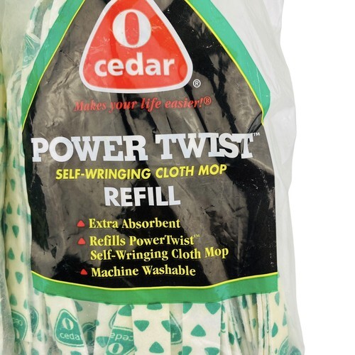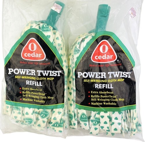 Two new old stock, sealed O Cedar Power Twist mop refill heads. Self-wringing cloth mop with rayon/polyester cloth strips. The copyright on the packages is 2001. There is light shelf wear on the plastic packaging and some discoloration on the cloth strips due to age. **These mop heads screw on to the O-Cedar PowerTwist handle only; please ensure they are the correct type for your mop before purchasing.** From a smoke-free home. Ships next day!