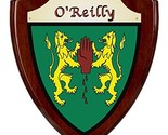 OReilly Irish Coat of Arms Shield Plaque - Rosewood Piano FinishThis piece of your family'??s Irish history is true to how it may have been originally used, painted in bright colors across a protective shield, turning a simple protective weapon into a symbol of honor, and as a way to recognize the fallen.Your authentic Irish family coat of arms is permanently imprinted in full color on a brass toned shield, which is then affixed with three brass screws to a handsome 8" x 10" Rosewood Piano Finish plaque. It will arrive ready to mount on any wall and to silently pay homage to the history of your Irish family. Choose from over 1000 available family coat of arms.Rosewood Piano FinishImprinted 4-color on a brass shield plateShield plate fastened with three brass screws8"wide x 10"highBackside - felt backingReady to hangChoose from over 1000 Irish crests