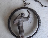 Unique, antique odd cast iron hanging piece, a chain link that dangles a cast iron ring that has what looks like an Asian man with arms extended. Unusual old piece in very nice shape with some light rusting on the base and light wear. Really odd. No maker marks seen. Must be early 1900s era. About 5 1/2 inches tall and 5 1/4 inches wide.