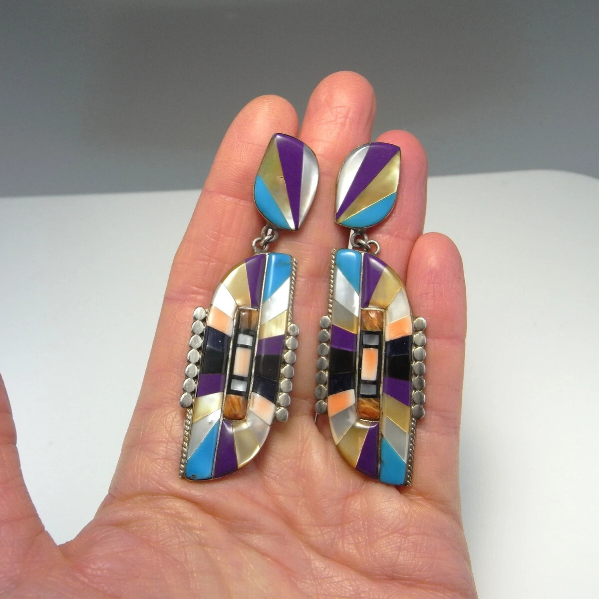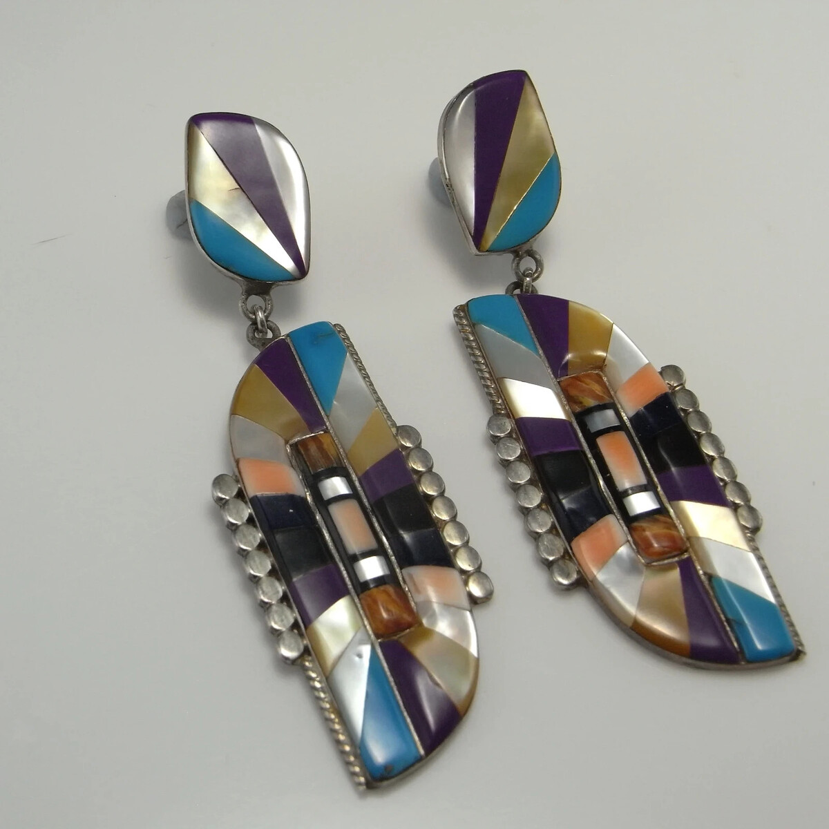 showstopping pair of vintage southwestern earrings set with eye catching inlay and crafted in sterling silver.