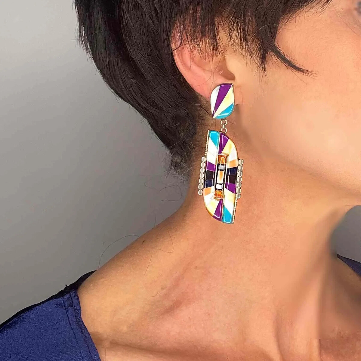 - OOAK Inlay Southwestern Drop Chandelier Screw On Earrings Non Pierced 1970s