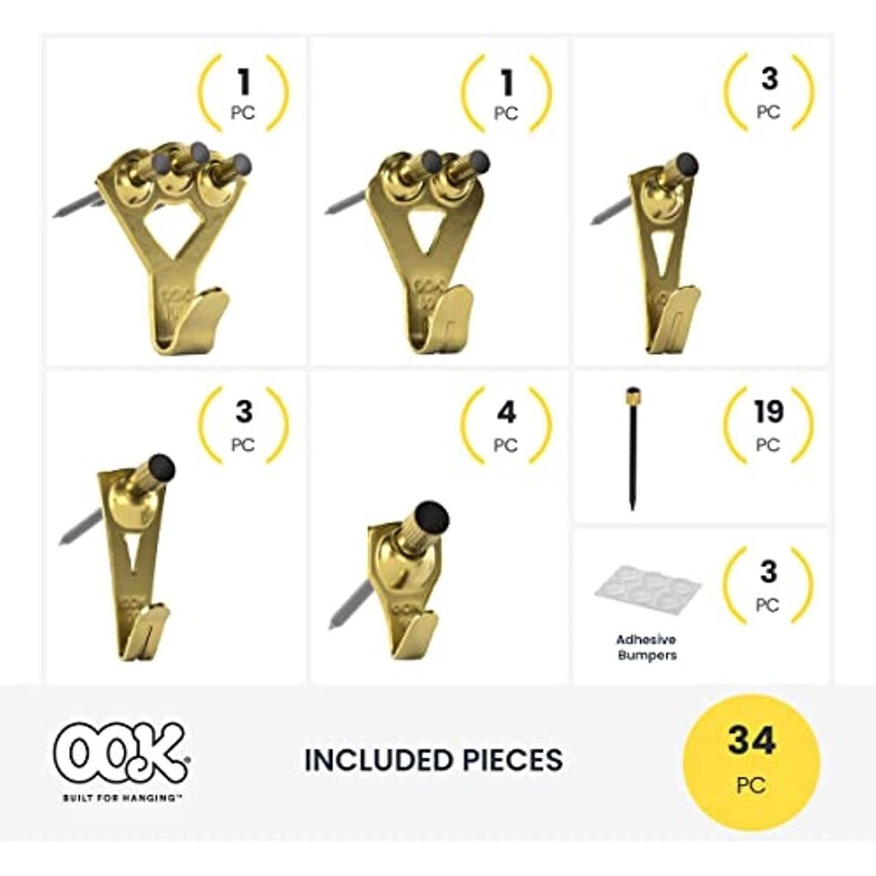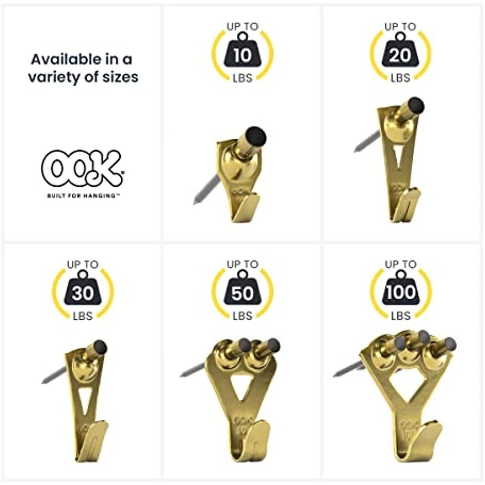 Product Description OOK Padded Professional Hangers are great for protecting walls. The padded back prevents scraping and scratches. These hooks will complete any at home or studio gallery with a professional look. Each picture hook comes with blued steel nails that leave only a pin size hole in walls to avoid any long term damage to your home. These professional picture/art hangers are great for plaster and drywall surfaces. These OOK hangers come in a unique Tidy Tin container, which is great to store in drawers or tool boxes. The OOK 50918 features a brass finish and includes different weight rated hooks of 10lbs, 20lbs, 30lbs, 50lbs and 100lbs. From the Manufacturer Hangs up to 17 works of art. Includes various sizes of professional picture hangers. Case hardened blue steel nails are reusable and leaves only a pinhole. Will not damage your walls. Great for professional, hobby, and home use. Used by museums and galleries worldwide.