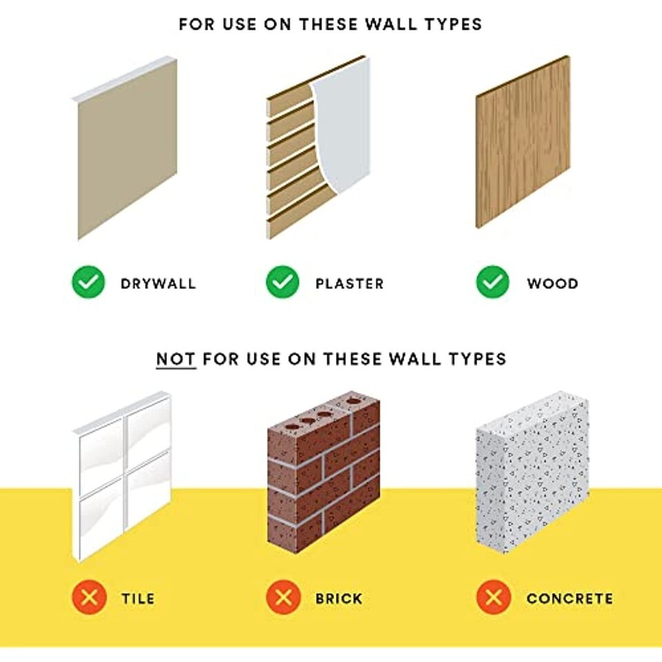 For drywall and plaster wall surfaces. The value pack kit includes different weight rated hooks ranging from 10lbs, 20lbs, 30lbs, 50lbs and 100lbs.
