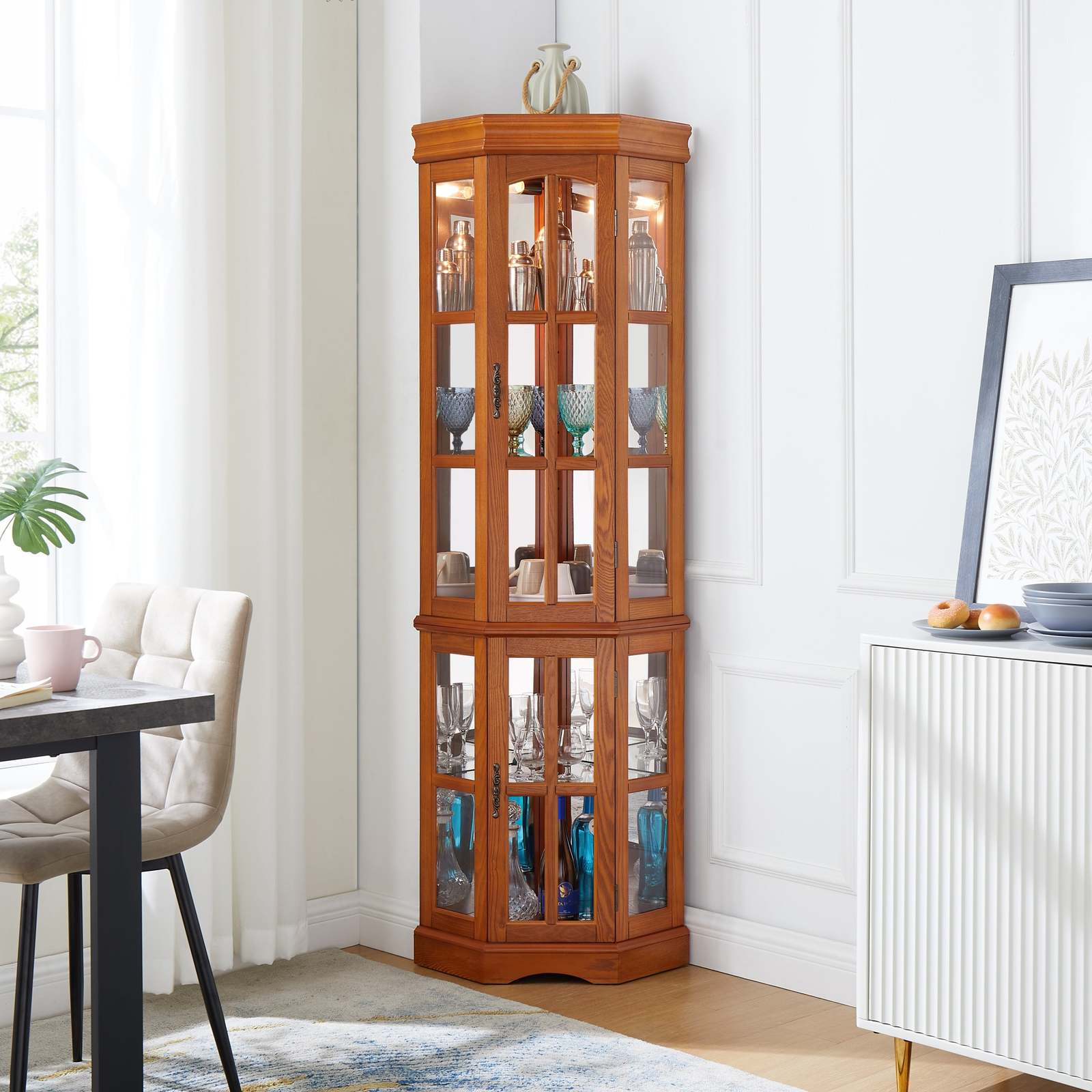 Compact Design: The corner china cabinet is designed to fit in the corner - taking up minimal space. Add style and decor to the corner in your room.