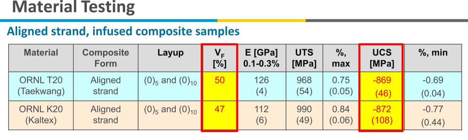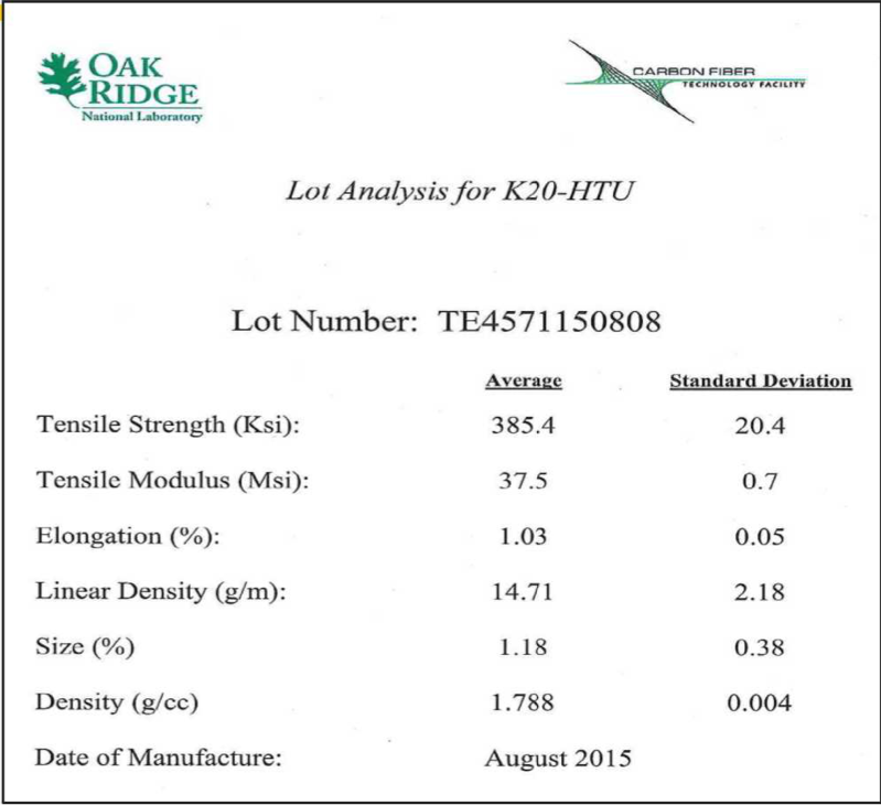 Roll Tow Forged Yarn Filament Tow. This bundle is for approximately 4.54lbs of Oak Ridge Carbon Fiber Carbon Fiber. They weight approximately 2.06 KG = 4.54 lbs lbs in total. ORNL K20 KALTEX ---COMPOSITE FORM = Aligned strand ---LAYUP = (0)5and()10 ---Vf[%] = 47 ---E[GPa] 0.1-0.3% = 112 (6) ---UTS[MPa]=990(49) ---UCS[MPA] = -872(108)