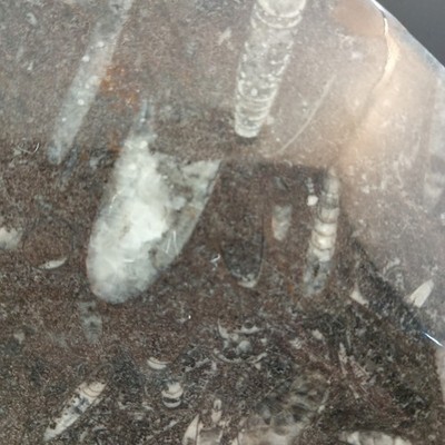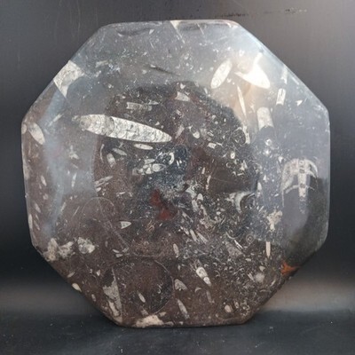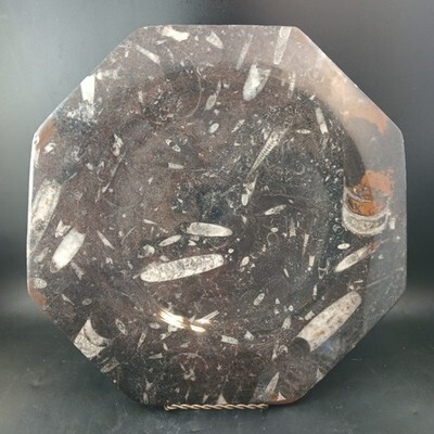"The product is a large 12" polished Orthoceras fossil plate featuring an octagonal shape. This unique piece is sure to be a standout addition to any collection of rocks, fossils, or crystals. The black color adds a sleek and sophisticated touch to the display, making it a visually striking piece for any collector or enthusiast. The Orthoceras fossils are not only aesthetically pleasing but also offer a glimpse into the prehistoric world, making it a valuable and educational piece for any collector."