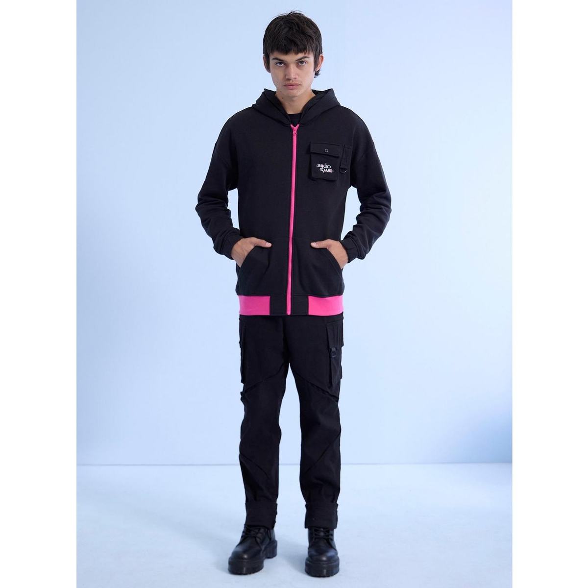 Step into the world of the hit series Squid Game with this officially inspired guard hoodie. Crafted from soft, breathable fleece, this black zip-up sweatshirt features a bold pink zipper, utility chest pocket, and embroidered "Squid Game" logo for a screen-accurate look. Whether you're cosplaying, lounging, or making a bold fashion statement, this hoodie delivers style and comfort in one.
