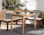 Features: Handwoven Rattan Charm- Elegantly arranged natural rattan adds coastal charm with a light, airy aesthetic Durable Construction: Constructed from Acacia Wood, Natural Rattan, Rubberwood, Metal, and Engineered Wood Woven Embellishments: Latticed panels create a breezy display that accentuates the flowing silhouette of each bench Padded Seat Cushions: Upholstered seat cushions upholstered in cozy fabric adds extra comfort Space Saving L-Shape: Designed to tuck neatly into kitchen corners or nooks to maximize seating while maintaining floor space Wide Rectangular Tabletop: The wide tabletop comfortably seats up to four Set Includes: Two (2) Corner Benches; One (1) Table