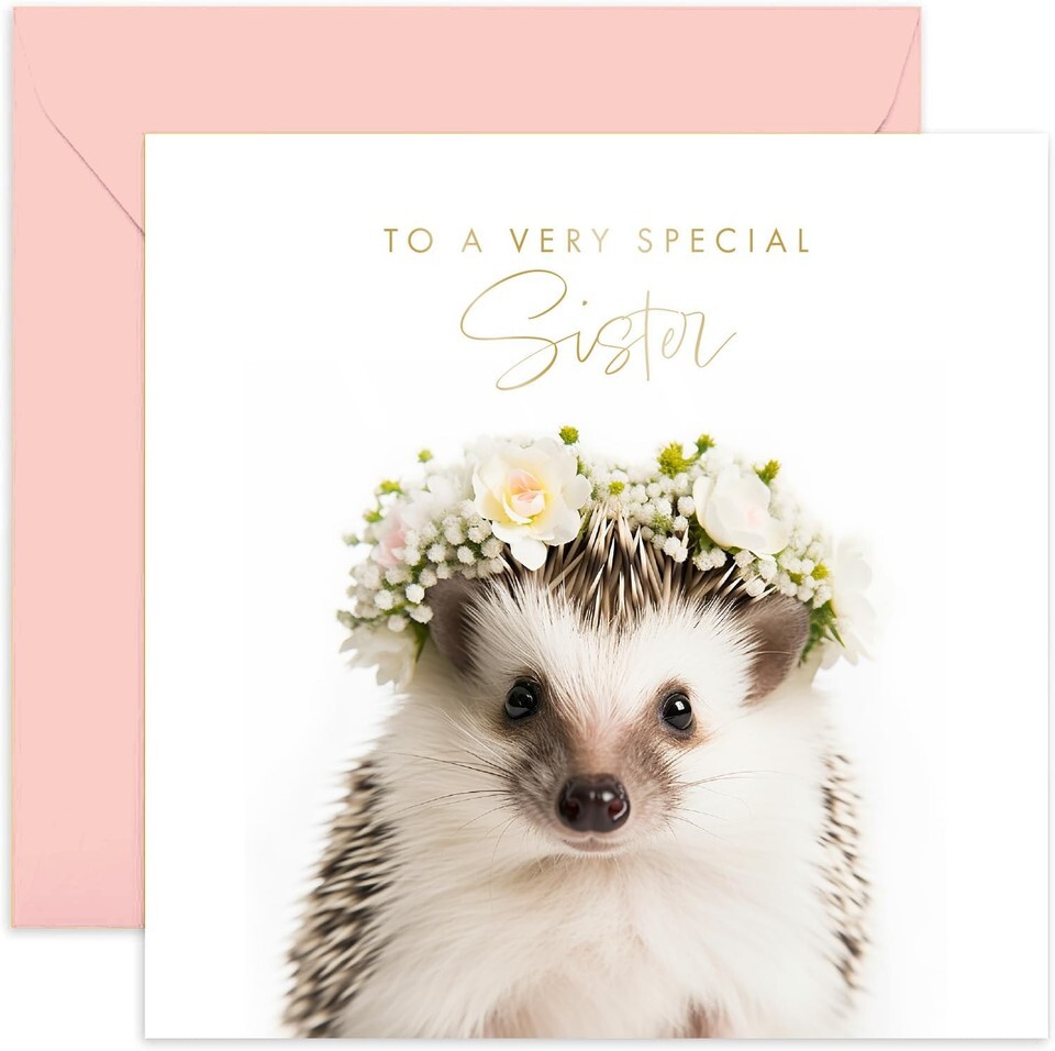 - Old English Co. Hedgehog Sister Birthday Card Floral Gold Blank Envelope