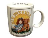 Friends coffee mug or hot chocolate mug . Raggity girl doll and a cute cuddly patched teddy bear are below the saying "Old Friends" Inside the top side of the cup " Are The Best Friends"