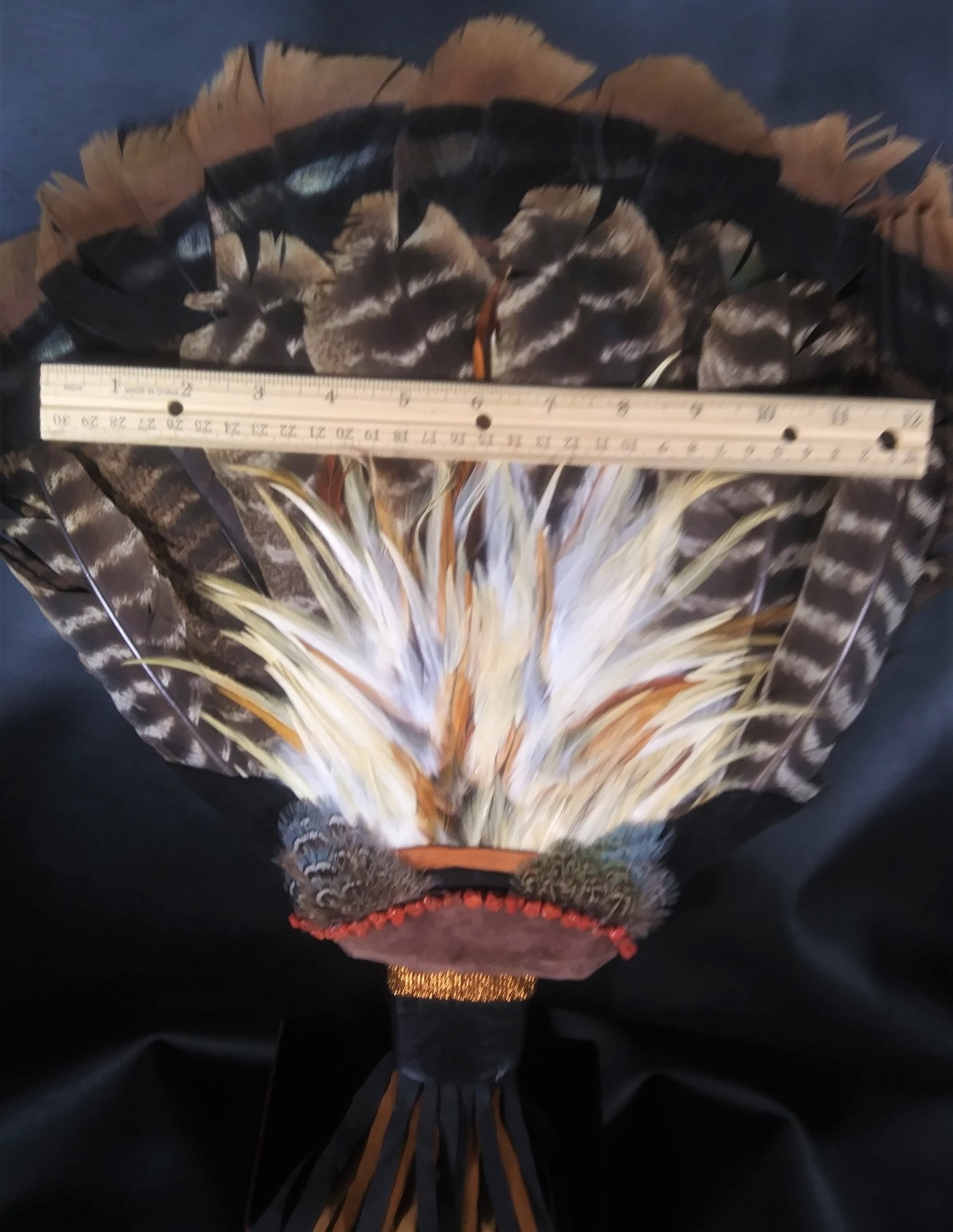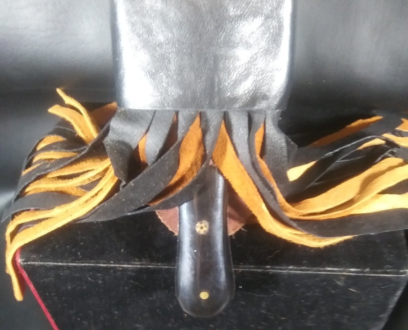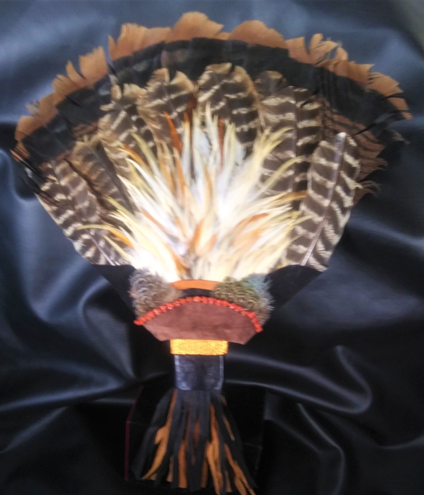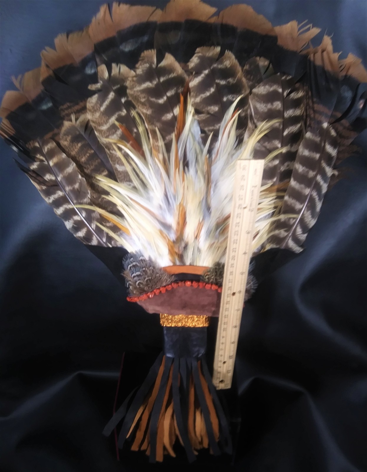 This listing features a one of a kind Old West Saloon Girl Facinater Feather Fan. This elaborate hand made facinater fan is a beautifully made recreation made from several types of real feathers and feathered plumes, and using genuine leathers and suede, it is mounted on a very old and yet very sturdy wire and wooden frame. It features a beautiful row of real, tiny coral rocks on it's front panel of leather which is several overlapping layers thick. Its beautifully textured black leather handle features multicolored fringe leather hanging from the bottom and then something a little extra and extraordinary.