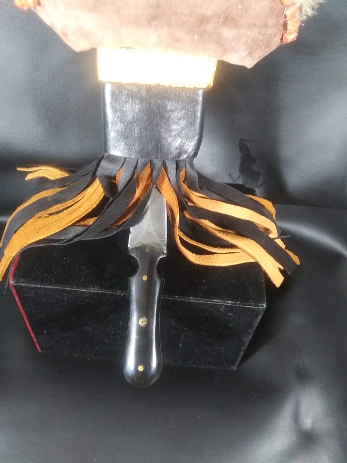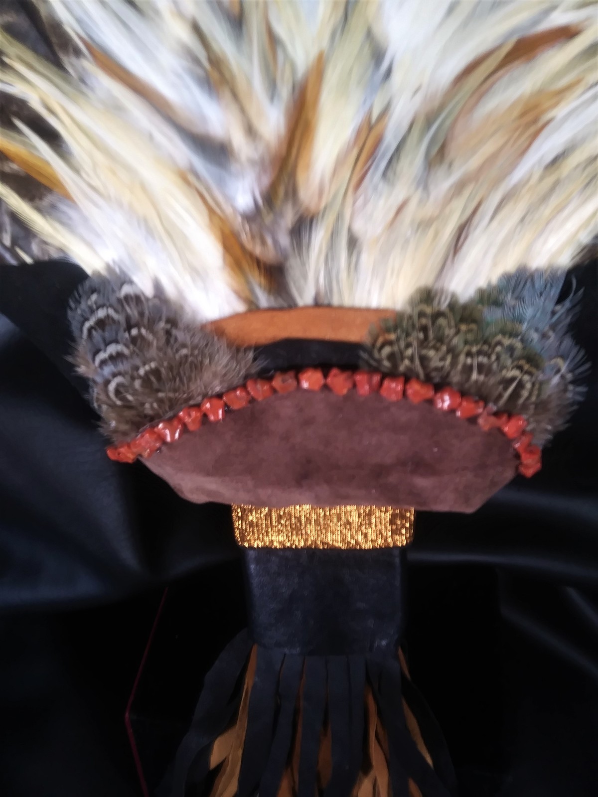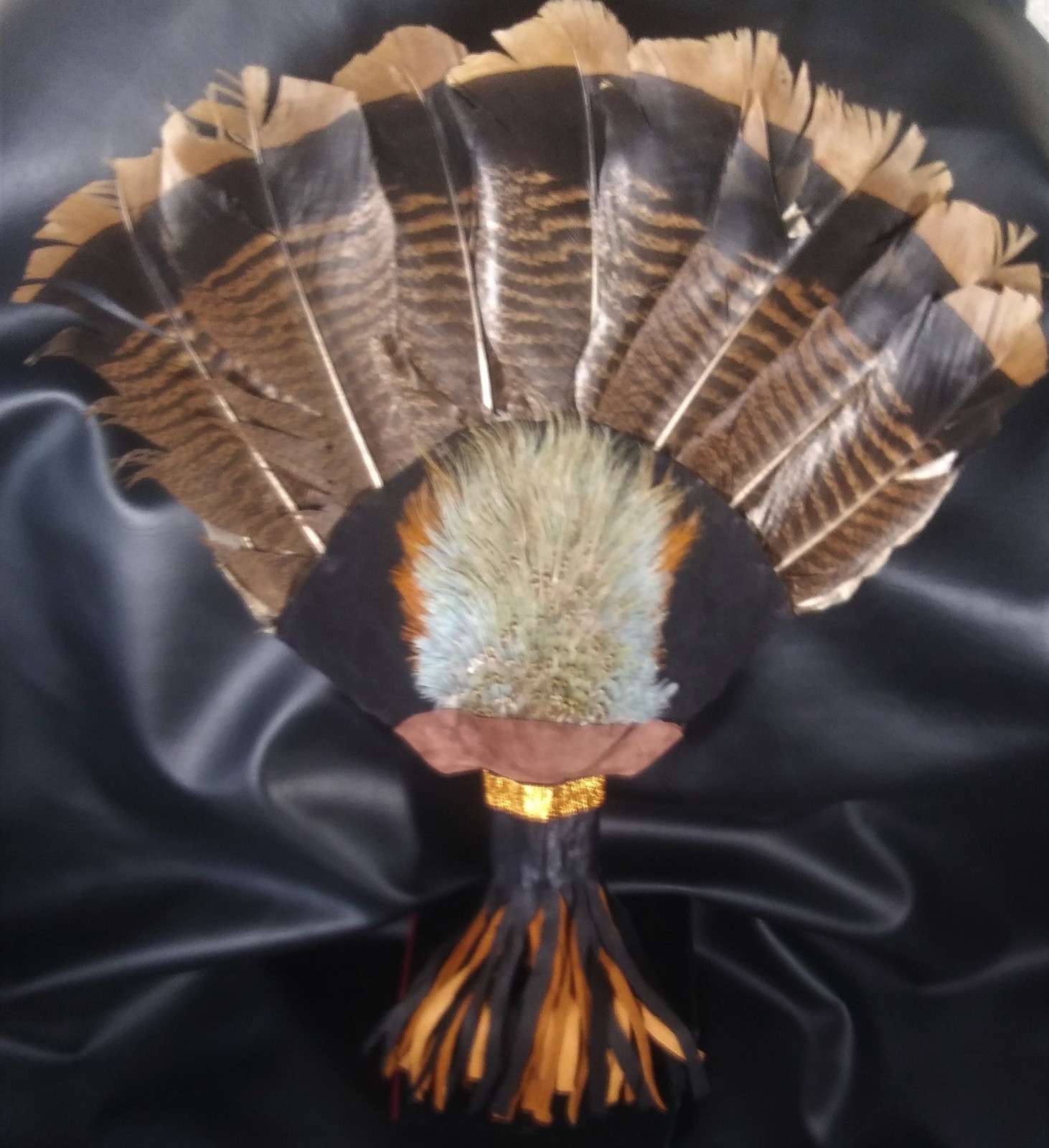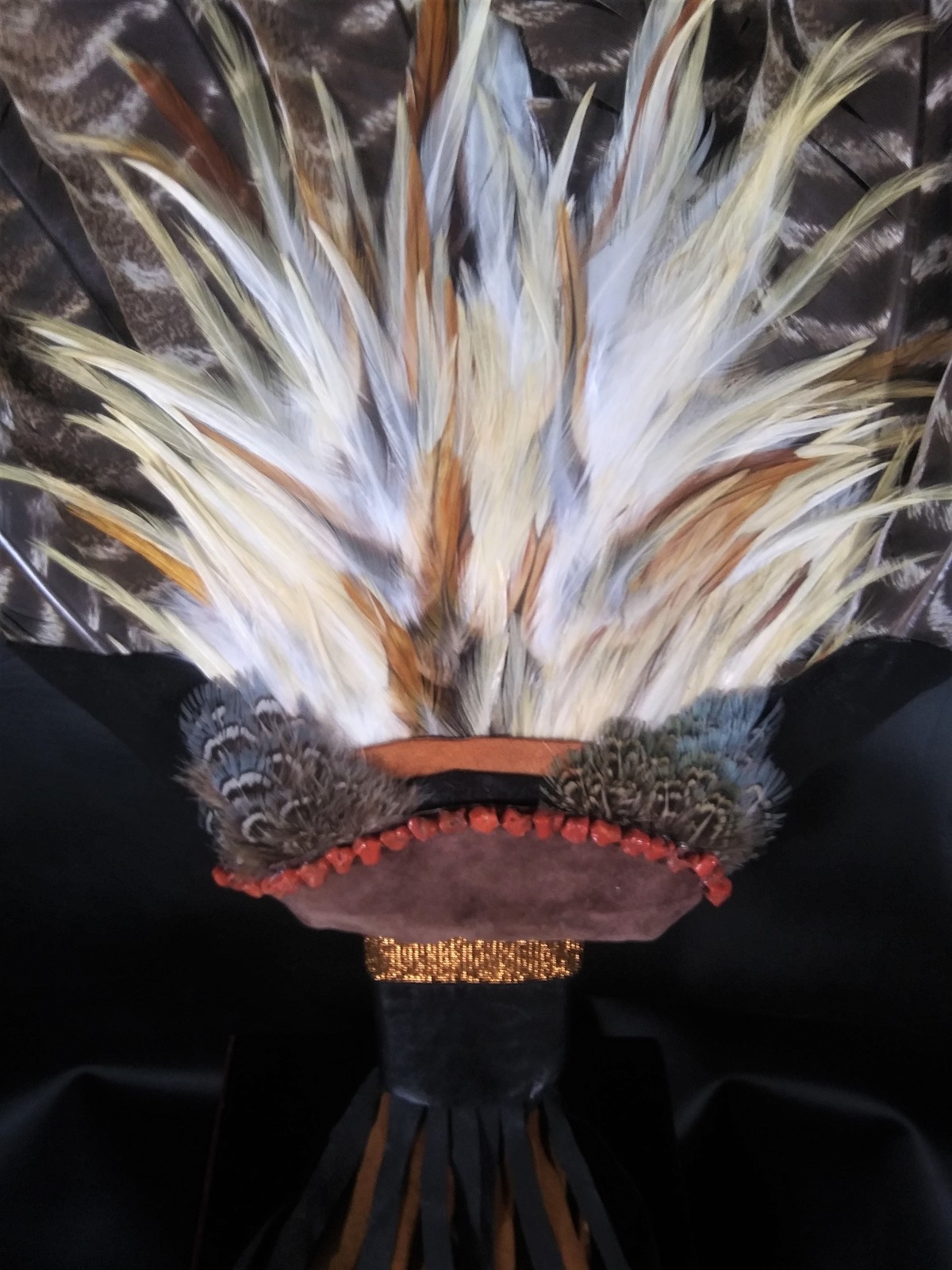 This listing features a one of a kind Old West Saloon Girl Facinater Feather Fan. This elaborate hand made facinater fan is a beautifully made recreation made from several types of real feathers and feathered plumes, and using genuine leathers and suede, it is mounted on a very old and yet very sturdy wire and wooden frame. It features a beautiful row of real, tiny coral rocks on it's front panel of leather which is several overlapping layers thick. Its beautifully textured black leather handle features multicolored fringe leather hanging from the bottom and then something a little extra and extraordinary.