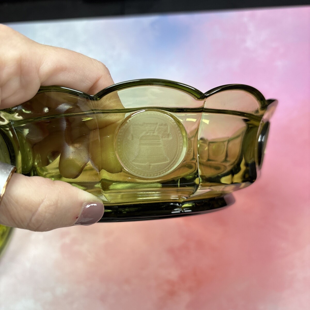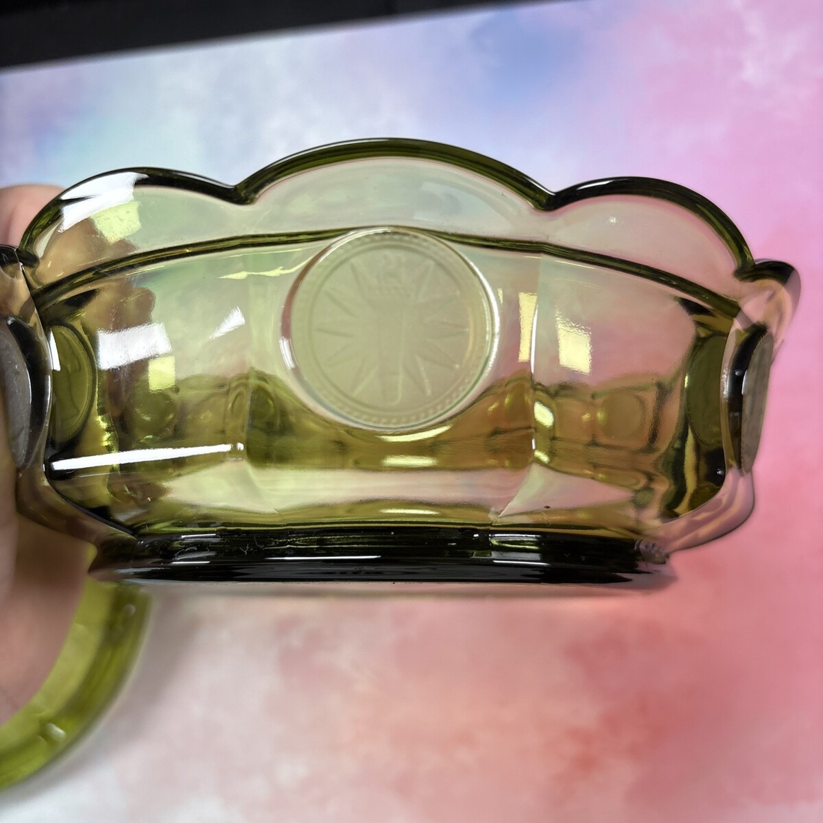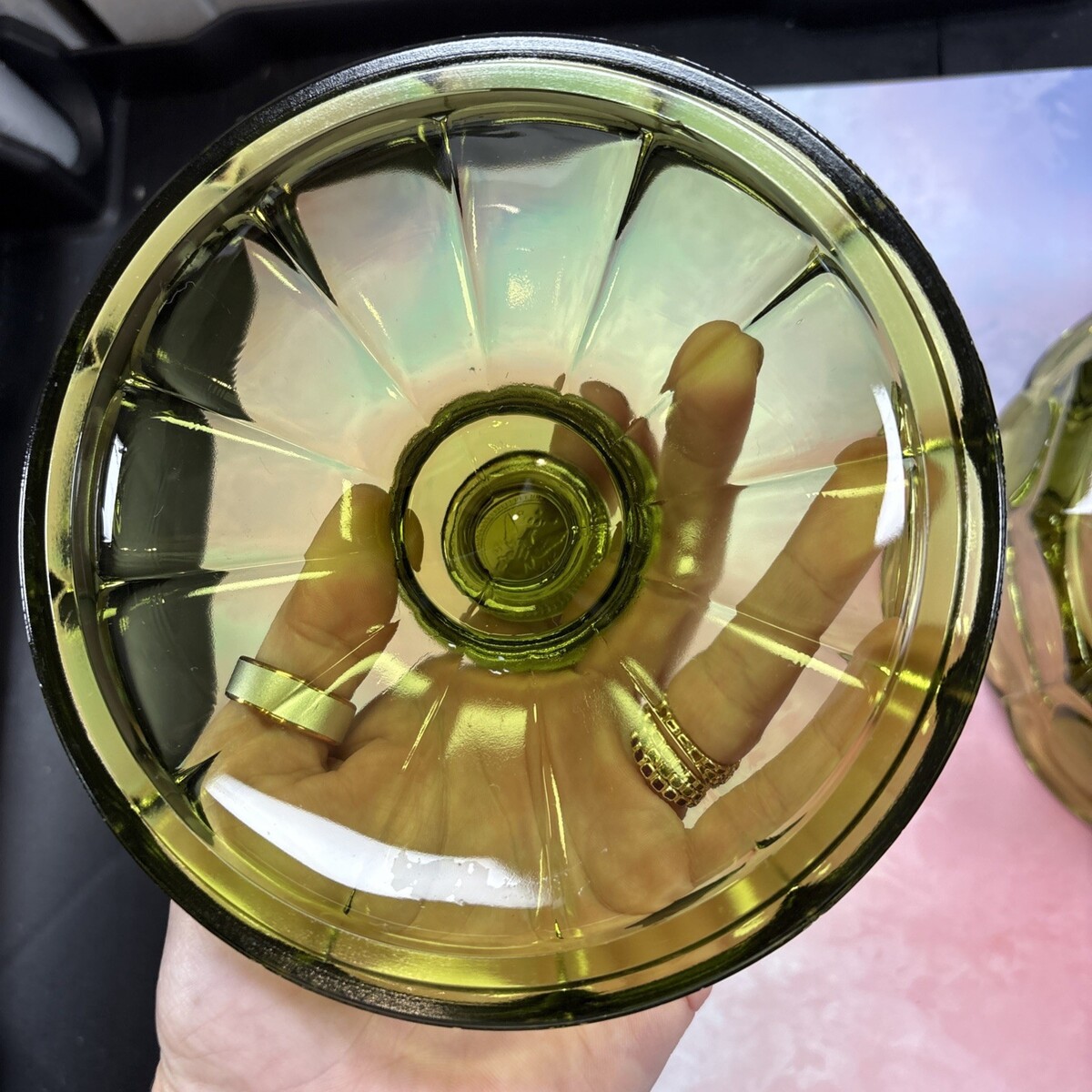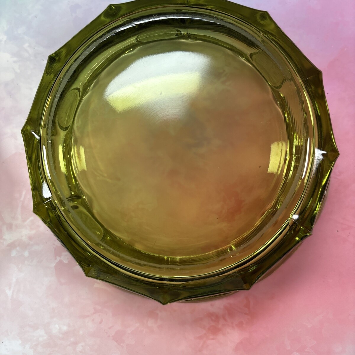 - OLIVE FOSTORIA COIN GLASS CANDY DISH WITH LID 6 1/4” X 2”