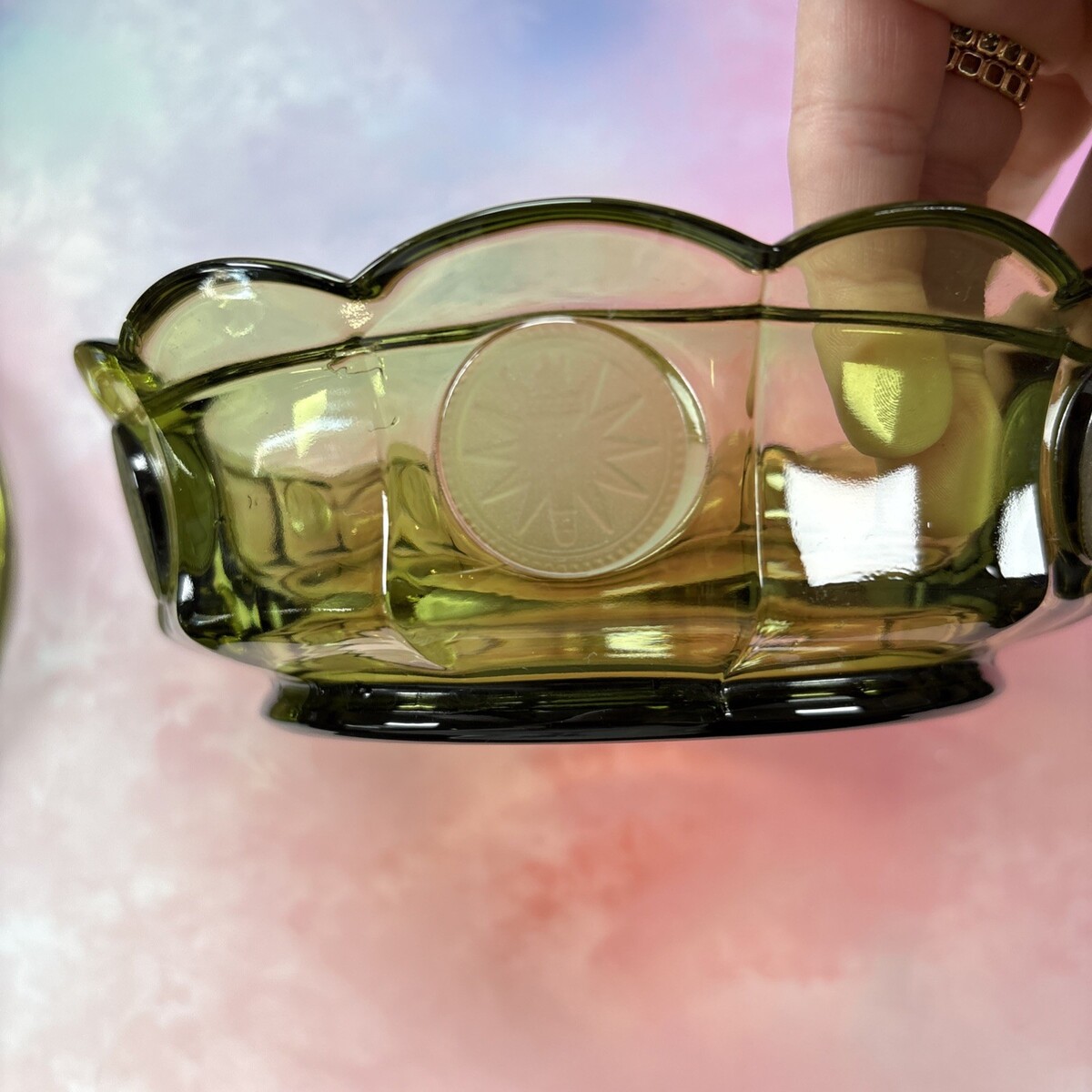 The Olive Fostoria Coin Glass Candy Dish with Lid is a vintage collectible from the mid-20th century, manufactured in the United States in 1960. This pressed glass dish features a unique coin theme design in olive color, measuring 6 1/4" x 2". Perfect for storing candy or other small trinkets, this Fostoria candy dish is a charming addition to any home decor, showcasing a piece of American glassmaking history.