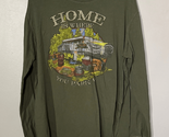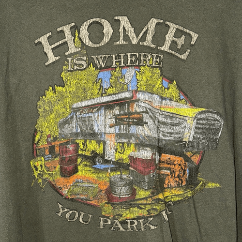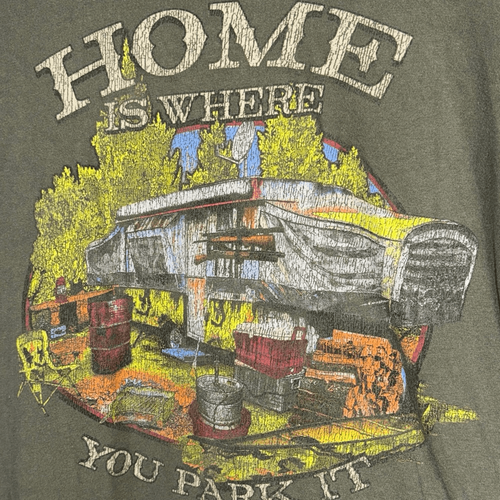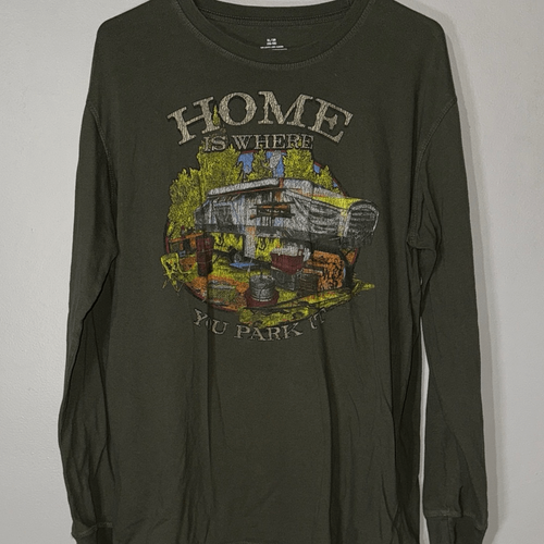Olive long sleeve tee with a colorful graphic print featuring a camper and the phrase 'Home is Where You Park It.'
