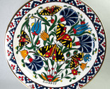 Olympia SA Ceramica Ibiscus 10" decorative plate. This colorful plate was "Hand Made in Rhodes in 24K Gold". The plate is decorated with butterflies and flowers. The plate has a rim chip that is not readily noticeable from the front. Great color. No other blemishes. Wire hoop on the back for hanging.