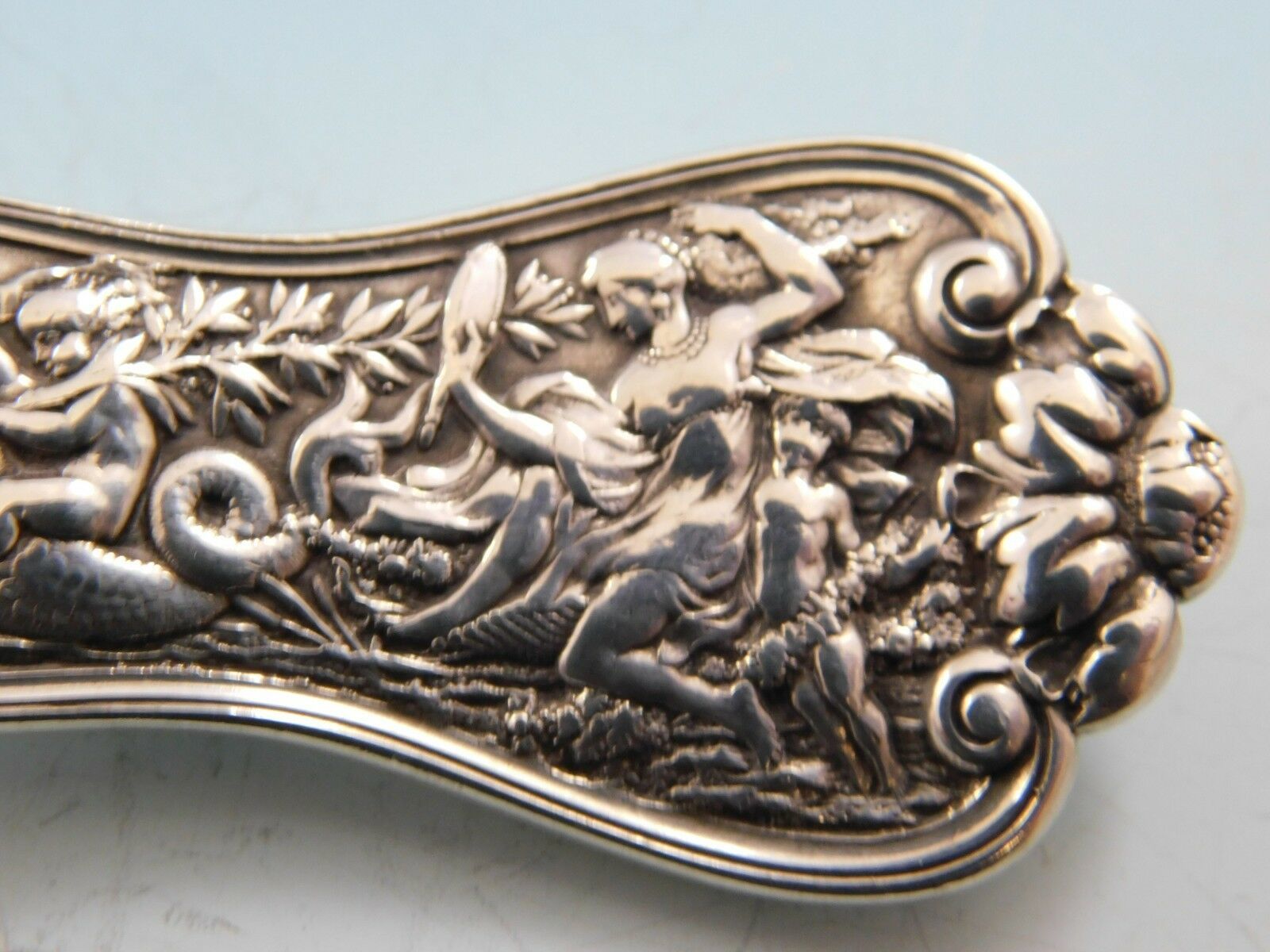 Stunning sterling silver Large Fish Server measuring 12 1/2" in the pattern Olympian by Tiffany and Co. The handle of this piece features the fourth motif in this pattern, which is Venus, born of the sea, being drawn into her shell by dolphins guided by Cupid. The back features emblems of love. This piece has a lovely design on the sterling blade. It is not monogrammed and is in excellent condition.