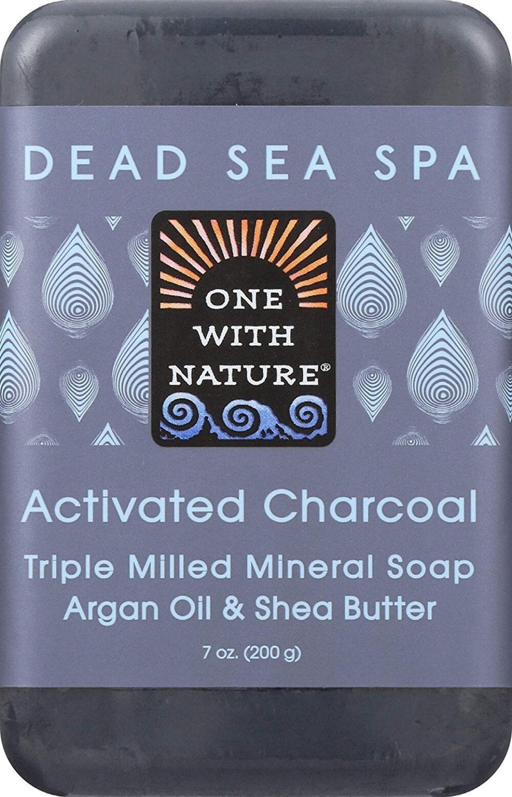 7 oz bar 6 Bars One with Nature, Dead Sea Mineral Bar Soap, Activated Charcoal, 7 oz (198 g) DESCRIPTION: Argan Oil Shea Butter Sustainable Palm Oil Non-GMO Project Verified Leaping Bunny; Cruelty Free Made with a unique combination of salts 21 essential minerals. The Dead Sea?s rich mineral salts deeply cleanse and tone. This unique soap combines pure Dead Sea salt, argan oil and shea butter in a natural vegetable base. Triple milled right at the source ? The Dead Sea. Absolutely nothing artificial. Scented with a natural botanical extract blend. SUGGESTED USE: INGREDIENTS: Sodium palmate (saponified palm oil), sodium palm kernelate (saponified palm kernel oil), water (aqua), sodium chloride (salt), glycerin (vegetable glycerin), parfum* (fragrance), activated charcoal, black 2 ci 77266 (plant based pigment), maris sal (dead sea salt), butyrospermum parkii (shea butter), argania spinosa (argan oil), citric acid, tocopherol (vitamin e). *Parfum is the required international ingredient term for all fragrances. Our fragrance is 100% natural and created from essential oils and a variety of sustainable botanical ingredients.