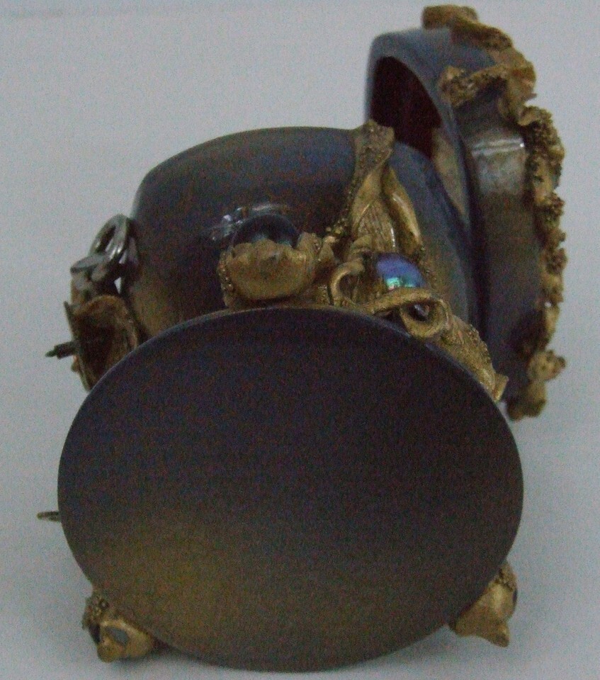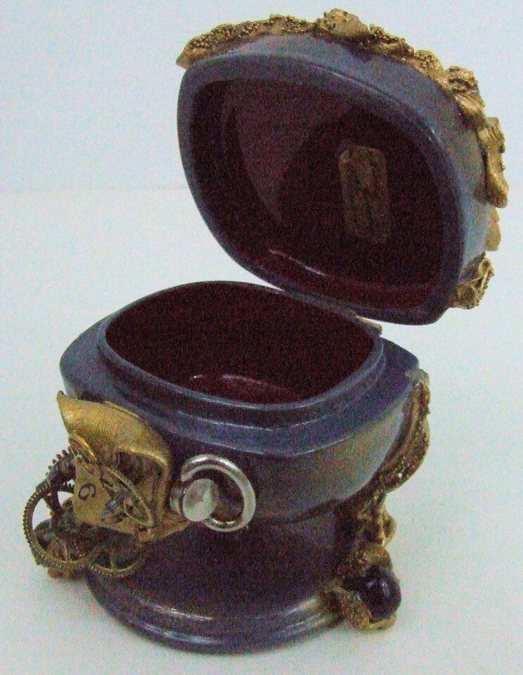 Elle, egalement a l'interieur du couvercle de la boîte, a presente un beau design rustique. La taille de la boîte est de 2 (5 cm) pouces de haut et la boîte elle-meme mesure 2,5 x 3 pouces de large (6 x 8 cm). La boite est signee par elle sur le couvercle interieur de la boîte.