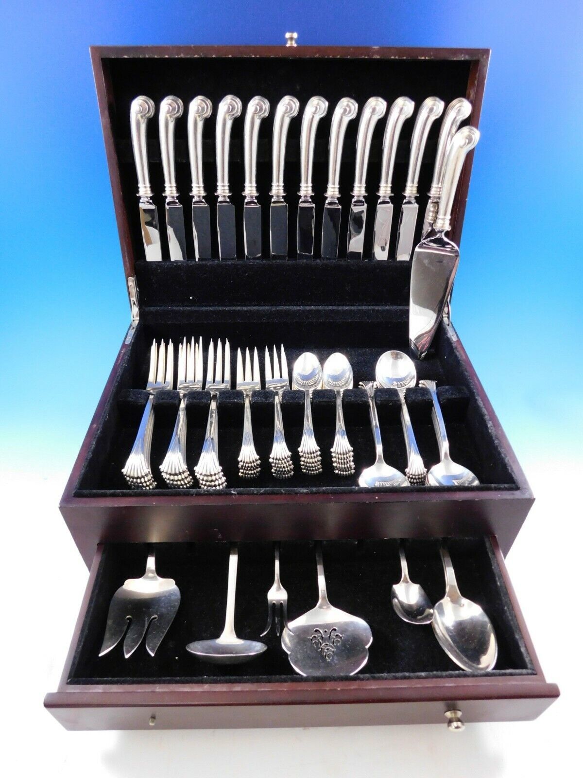 COMPLETE FLATWARE SETHOSTESS HELPERSHOLLOWWARE / TEA SETSMUSEUM QUALITY/FIGURAL SILVERFINE ESTATE VINTAGE JEWELRYMID-CENTURY MODERNSILVER FLATWARE SILVERWAREBuccellatiChristofleGeorg JensenNew Georg Jensen HollowwareNew Georg Jensen JewelryGorhamInternationalLuntMichael Aram - NewReed BartonTiffany Co.TowleWallaceWhitingPLACE SETTINGS