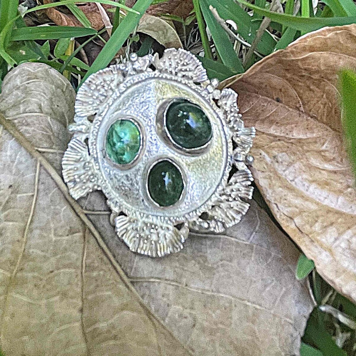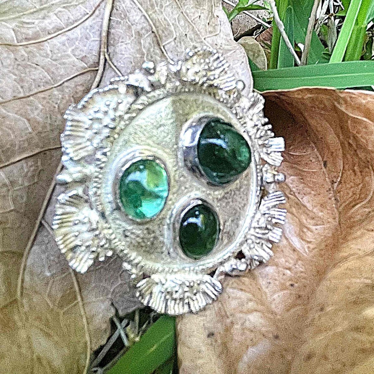 The green cabochon gems are all natural tourmaline and have been tested. They each vary slightly in color and have natural inclusions which are eye visible. These pretty gems are set in a large sculptural setting that makes an enormous visual impact on the hand.