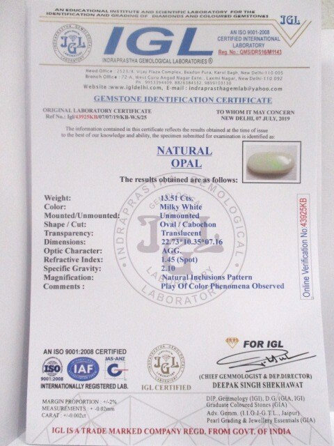 Opal e un gemma di bellezza, fascino, ricchezza e grazia divina. Porta a avere una vita lussuosa. Offre il potere dell'adempimento a chi lo indossa e migliora la prosperita finanziaria. E utile per coloro che sono in affari in particolare connessi a viaggi e turismo, importazioni ed esportazioni.