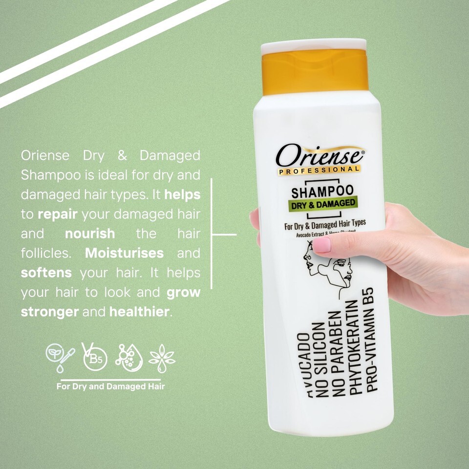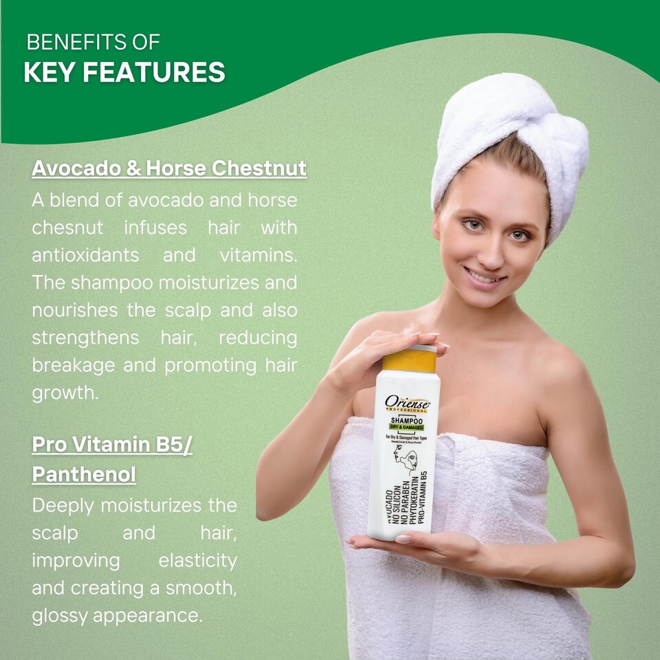 Revitalize and repair your hair with Oriense Professional Shampoo for Dry Damaged hair. This nurturing formula is designed to address the needs of dry and damaged hair, offering deep moisturization and repair. Infused with Avocado Extract, Horse Chestnut, and enriched with Panthenol and Phytokeratin, it works to restore hair health, combat frizz, and add a silky shine. Its gentle, chemical-free formulation is pH-balanced, ensuring your hair regains its strength and vitality.