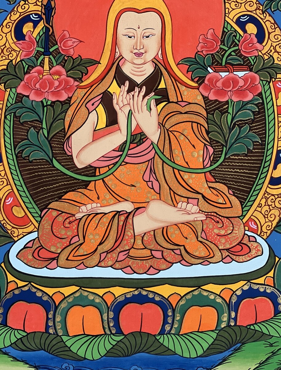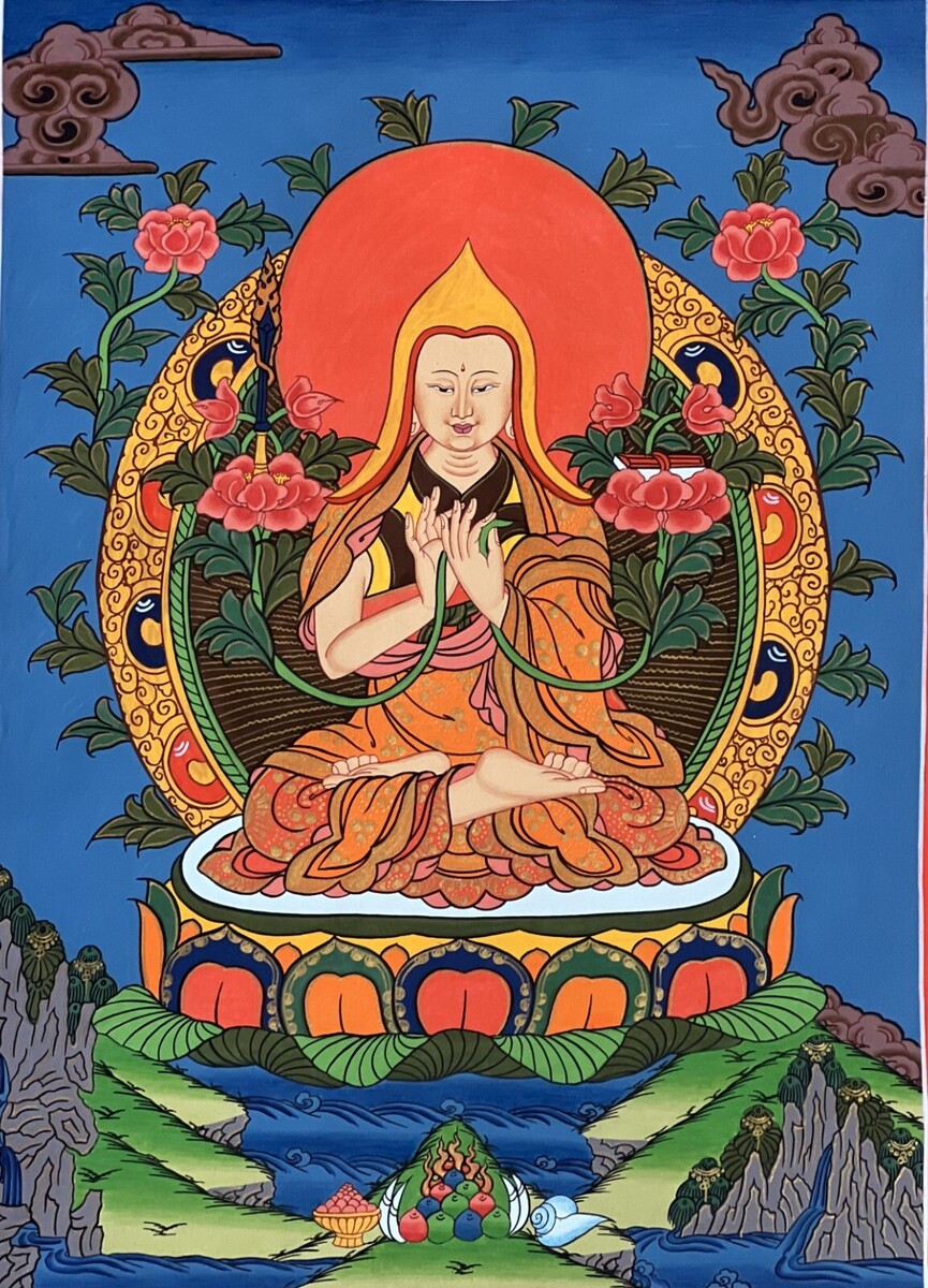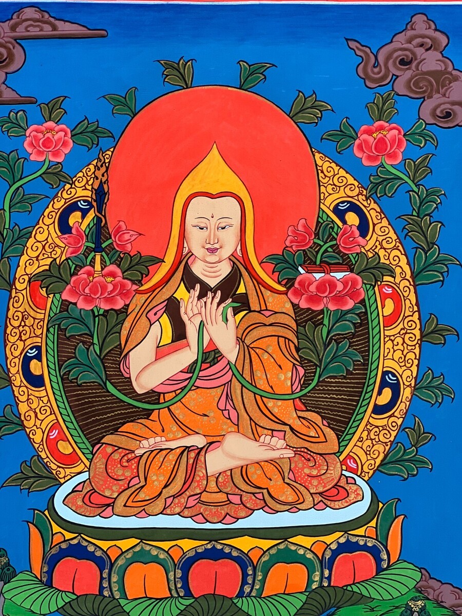 This is a original hand painted Tsongkhapa Tibetan Thangka painting. Tsongkhapa was an influential Tibetan Buddhist monk,