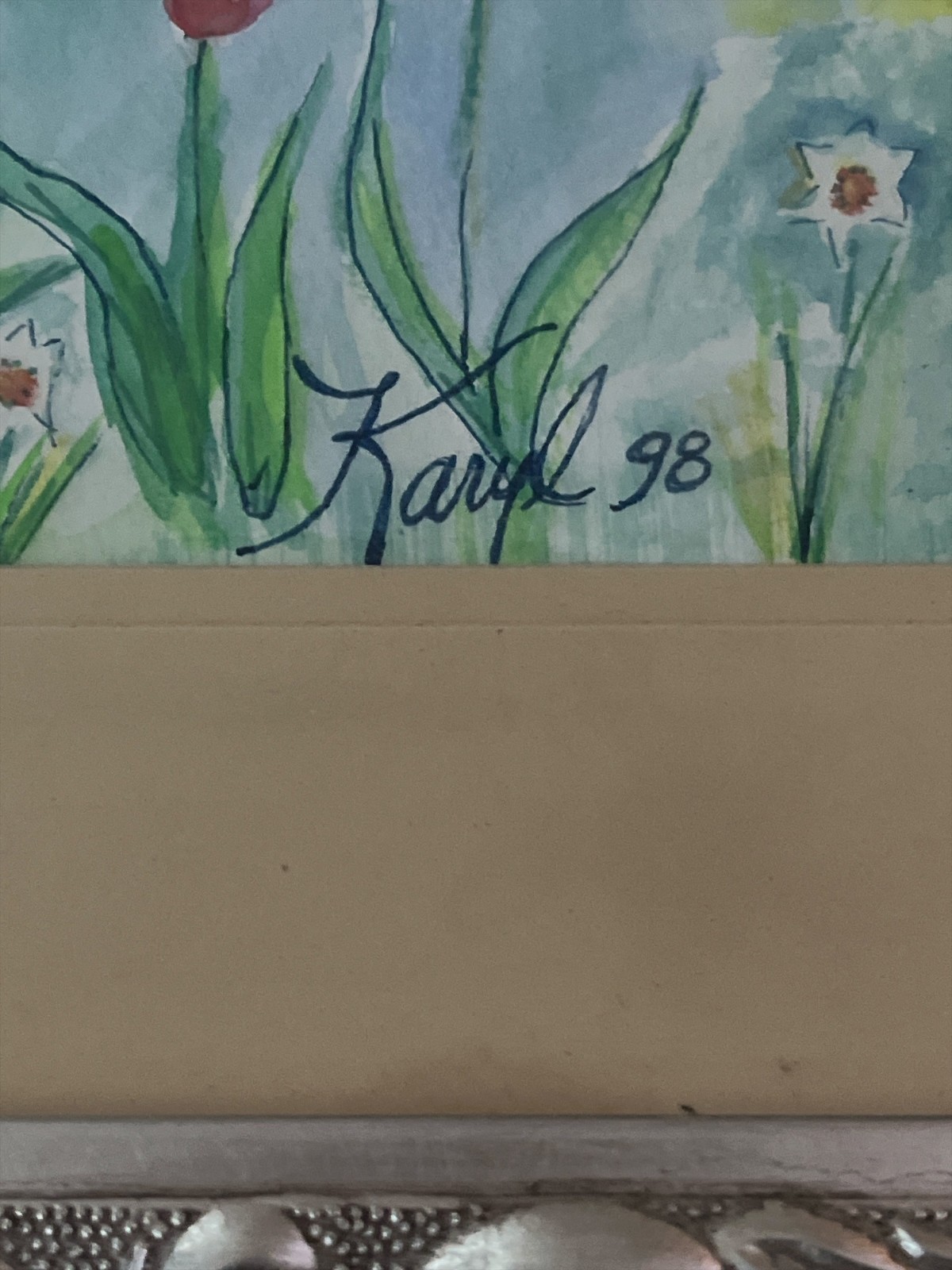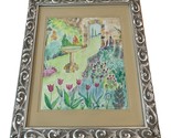 Charming original watercolor painting signed *Karyl 98*. The artwork depicts a peaceful garden scene with a stone archway, blooming tulips, colorful flowers, and a birdbath at the center. Housed in a decorative silver-tone frame with embossed scrollwork, this piece brings a touch of timeless elegance to any space.