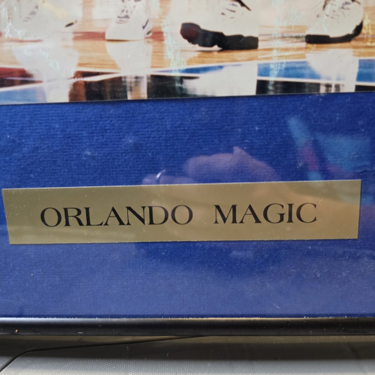 The product is a framed photo featuring Shaquille O'Neal and other players from the Orlando Magic basketball team. This original photo captures a special moment in basketball history and would make a great addition to any sports memorabilia collection. Perfect for fans of the NBA and the Orlando Magic, this collage framed photo showcases iconic team members and is a must-have for basketball enthusiasts.