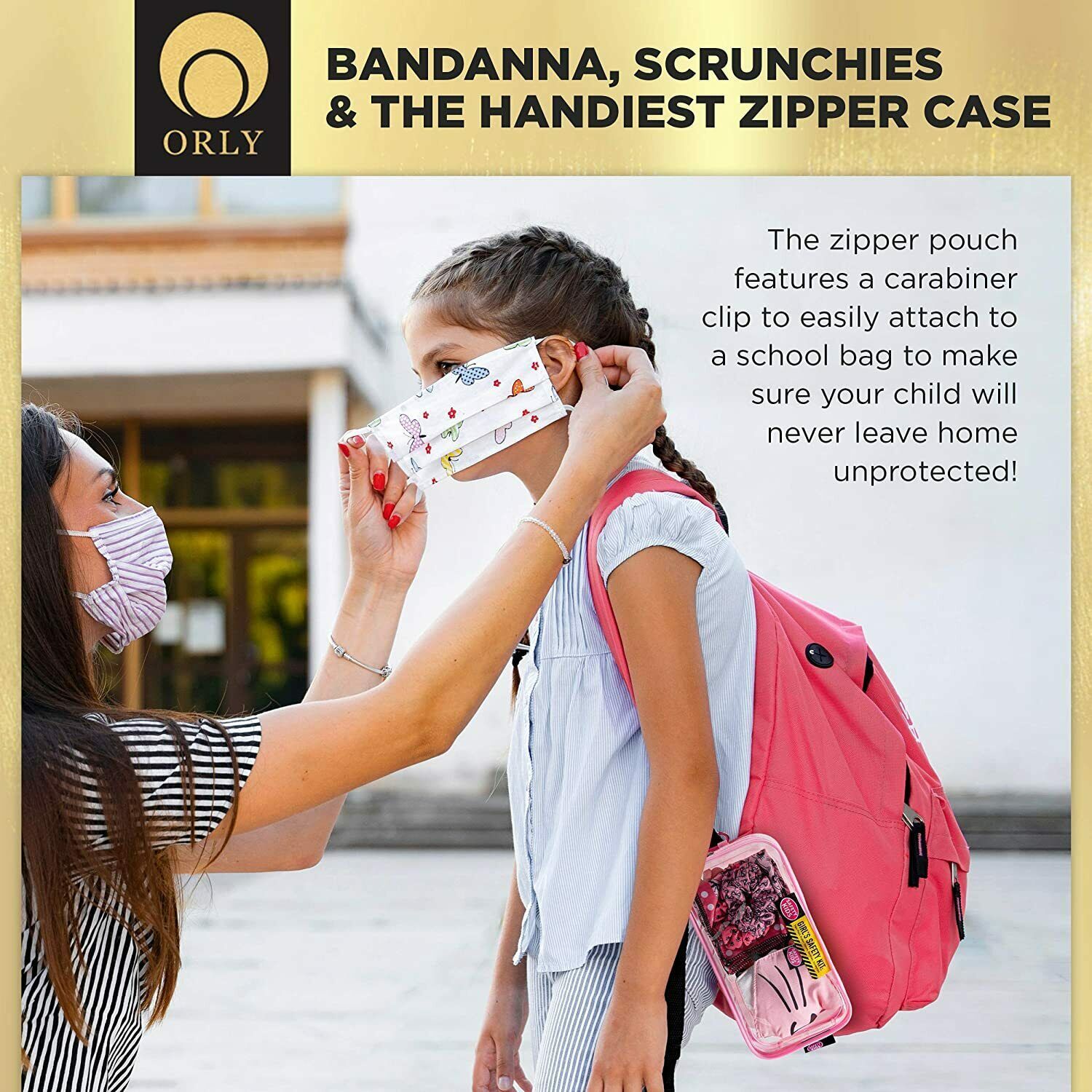 BANDANNA, SCRUNCHIES THE HANDIEST ZIPPER CASE: Each mask-kit also comes with a matching bandanna that can be used as bag or hair accessory, and of course as a neck-gaiter for an extra layer of protection. The zipper pouch features a handy carabiner clip to easily attach it to their school bag (or even their belt hoops) to make sure your little ones will never leave home unprotected. Plus, the girl?s kit includes 2 colorful scrunchies to complete their cute look