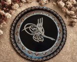 This exquisite decorative plate features Islamic calligraphy in Ottoman Tughra style, beautifully crafted with intricate detailing. The central design is surrounded by elegant hand-painted patterns in black, silver, and copper tones, making it a striking piece of spiritual and cultural art.