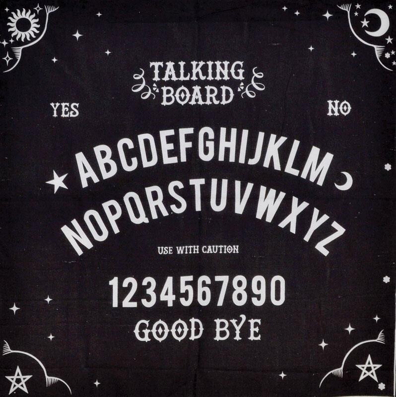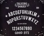 Large black cloth spirit board altar cloth with white lettering on rayon material. Classic spirit board image on front.