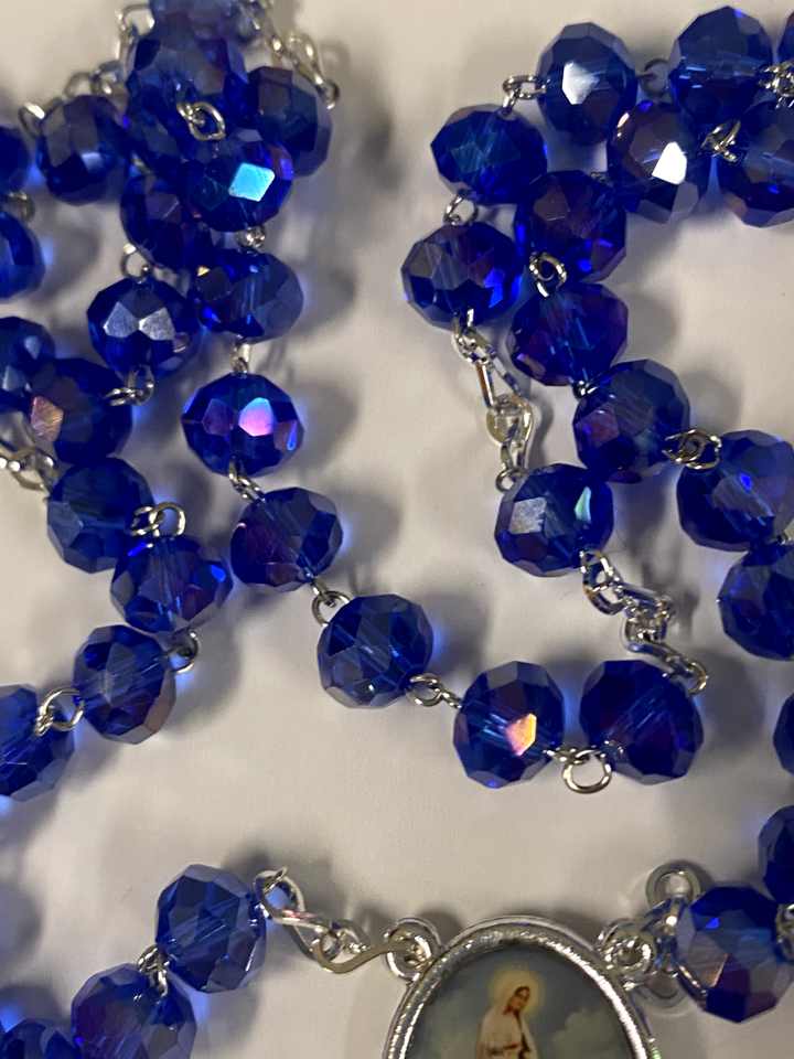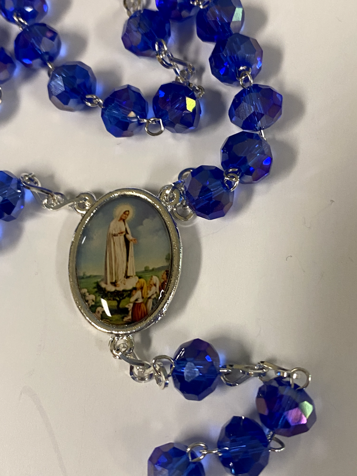 You are purchasing beautiful medium bead handmade rosary, the center contains a medal of Our Lady of Fatima. Comes with a small acrylic box.