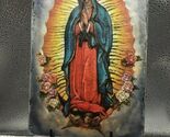 You are purchasing a beautiful arched title with an image of Our Lady of Guadalupe. Comes with scrolled metal stand and also the title has a keyhole hanger for the wall.