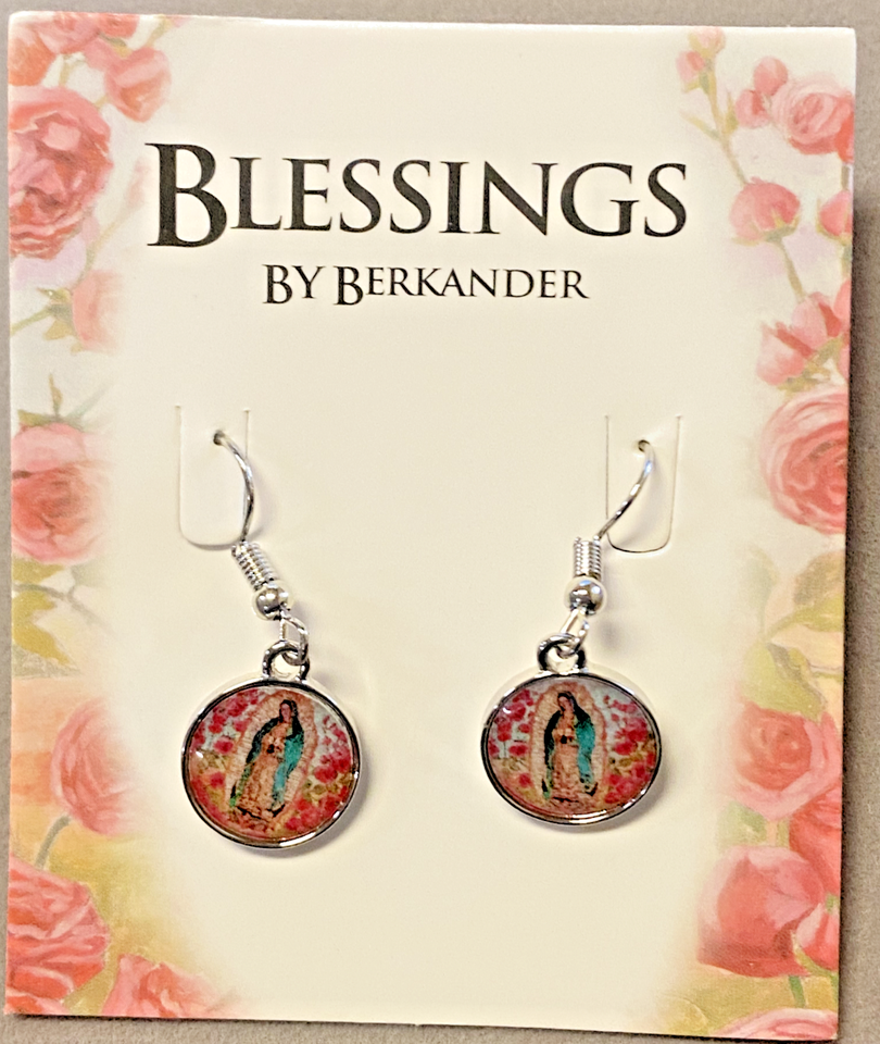 Your purchase is for a pair of cross dangle earrings with a round image of Our Lady of Guadalupe. They measure approximately .50" in diam. (1/2") in size, they come with shepherd hook backs. They are silver plated. See pictures for details. They come from the Berkander brand,under the Blessings Collection.