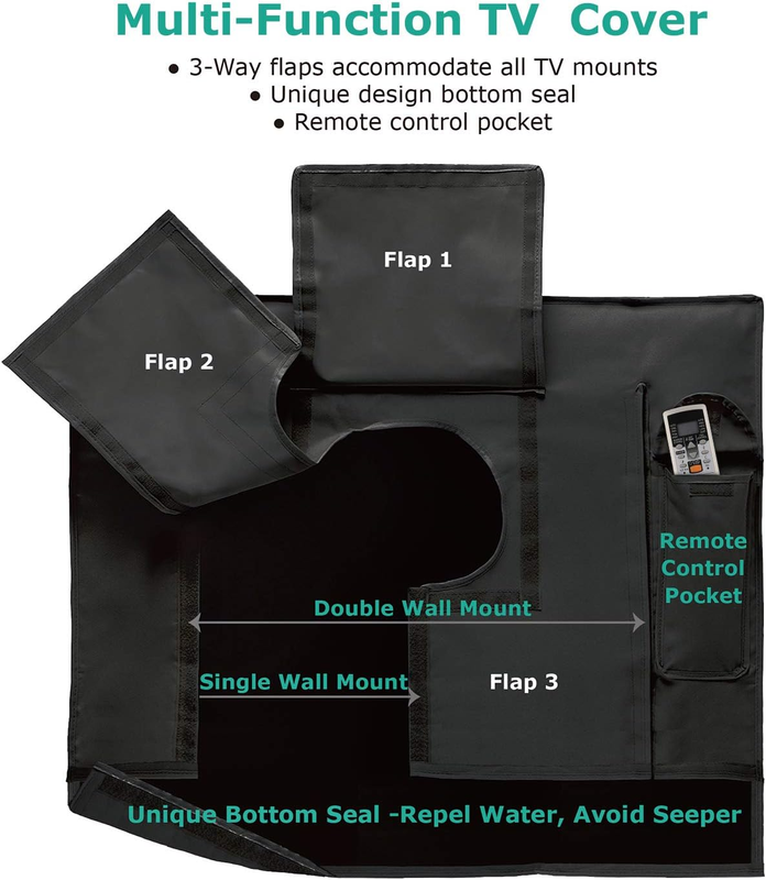 EASY TO COVER AND UNCOVER - constructed with 3 flaps, you can cover the TV from top to bottom or front to back, make applying and removing the TV weather protector much easier. A built-in pocket on the back is prepared for remote control
