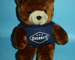 Features: Stuffed soft brown plush teddy bear wearing an Overnight navy blue tank top t shirt, Plastic eyes and nose, stitched mouth