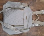 This minimalist creamy-white backpack is perfect for women who need a stylish and waterproof bag for their daily activities. The exterior is made of high-quality nylon with gold accents and embroidered details, giving it a sophisticated look. The bag has a zip closure and a small size that makes it easy to carry around.