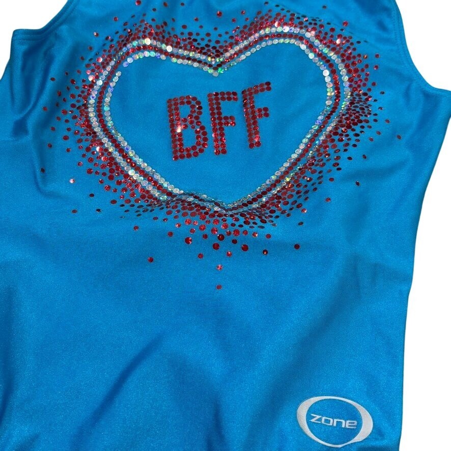 Celebrate the spirit of friendship with this vibrant blue "BFF" leotard. Adorned with glittering heart details, it?s designed for endless flips and fun.