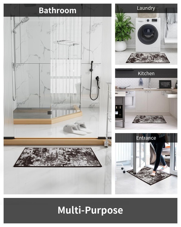 Multi-PurposeWe offer a variety of colors and sizes to choose from.The bathroom floor mat can also be used as a laundry rug mat,kitchen rug,in front of shower room,allowing smooth movement for wheelchairs.Say goodbye to slips and falls, and keep the bath mat securely in place even in high-traffic areas due to the low-pile soft material.