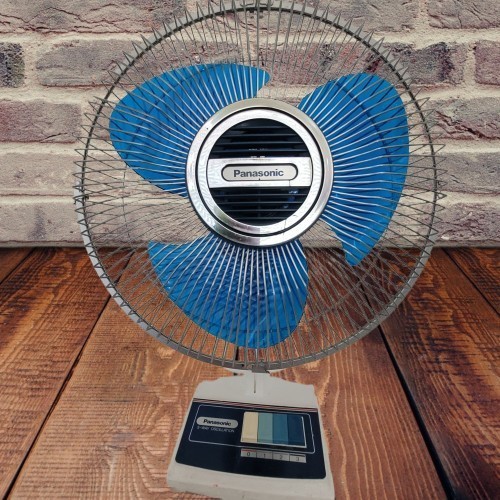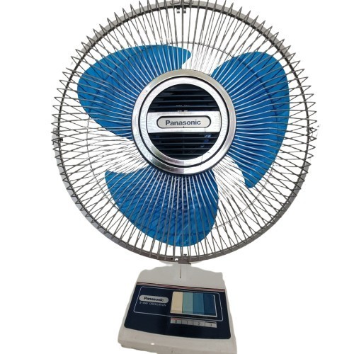 The Panasonic 3-speed 12" Electric Desk Fan with 5-Way Oscillation, model F-1208, is a vintage model, likely from the early to mid-1980s