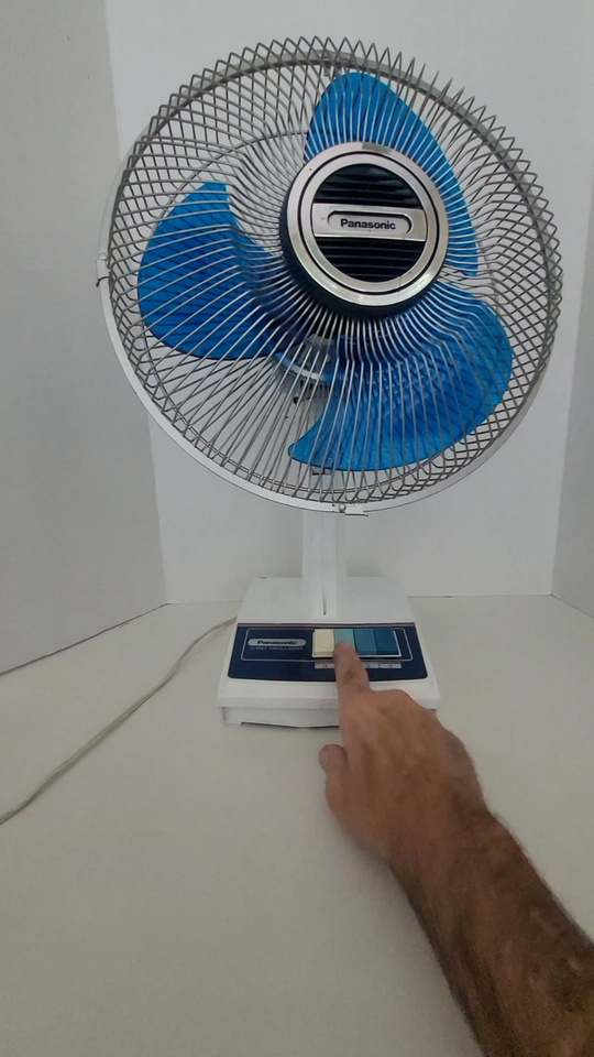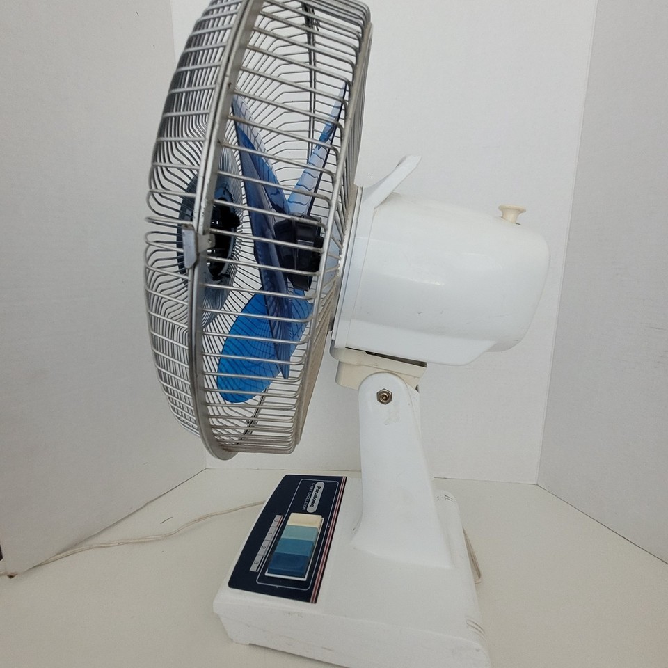 Here's a vintage PANASONIC 12", 3-Speed, Oscillating ELECTRIC DESK FAN model F-1208 Push button operation. Metal cage, blue translucent plastic blades, and white plastic housing and base. Stands about 21" tall. Cage is about 13" in diameter. Blades are 12" in diameter.