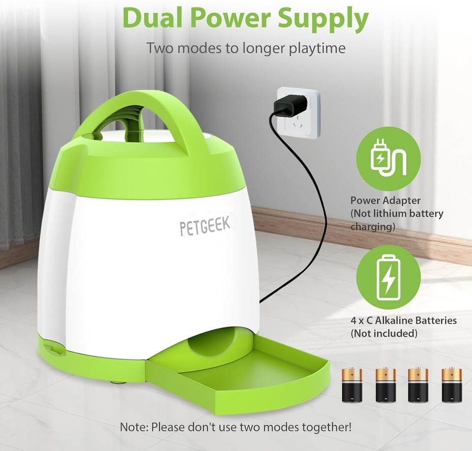 Dual Power Supply: PETGEEK dog food puzzle is made of food-grade natural material ABS. You could either install 4 x size C batteries (not included) in the host or connect it via the micro USB cable (not for battery charging). 3 x AAA batteries (not included) are needed for the remote controller of this electronic dog toy. Please turn them off when your dog is not playing