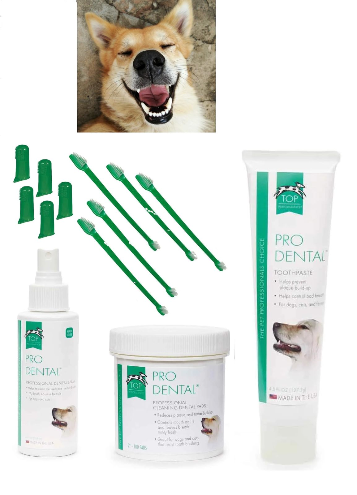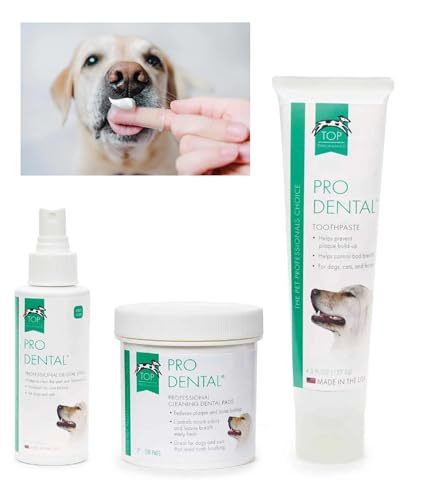 Product description: Carefully selected essentials for our All You Need 13 piece Pet Dental Hygiene Kit. Kit includes ONE 4.5 oz tube of Pro Dental paste, 100 cleansing pads, ONE 4 oz bottle of Dental Spray, 5 Finger Toothbrushes, and 5 Dual End Toothbrushes. The dental paste is also beef flavored for your fur baby's pallet delight. Dental spray requires no rinsing or brushing. Helps reduce tartar build up and freshens breath. Dental wipes also help reduce plaque and tartar build up! Finger toothbrushes and dual ended toothbrushes also included in kit for preference and convenience. Everything you need All In One Kit for an efficient dental cleaning for your pet's health. Take advantage of our cost conscience sets of 1, 2, 3, 4 or 5 Kits!
