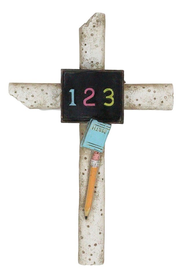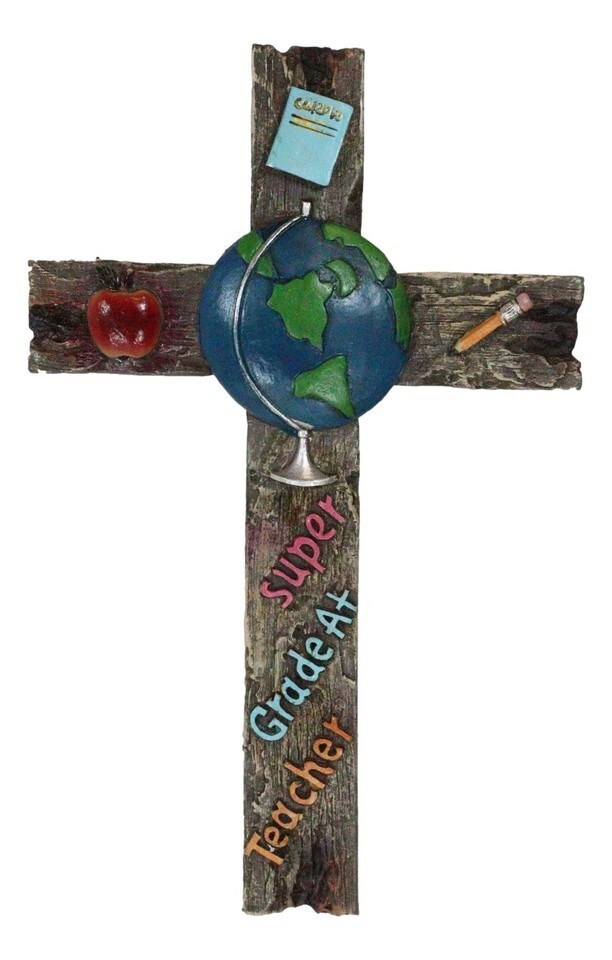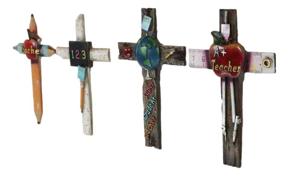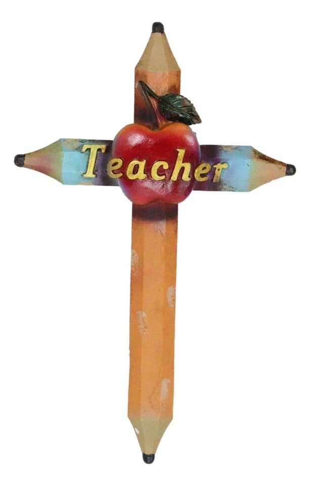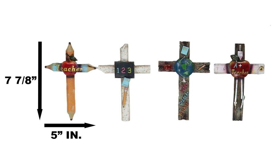 ? These hanging wall crosses are the perfect addition to any home of faith. Their unique style is sure to become a welcome staple of any room. Consider them as gifts for any of your faithful friends or family. These crosses are unique from each but complements well when hung together on your wall. Designed specifically for your favorite teachers or yourself if you are an educator! Each cross has elements of school; pencils, apple, 123, globe and more!